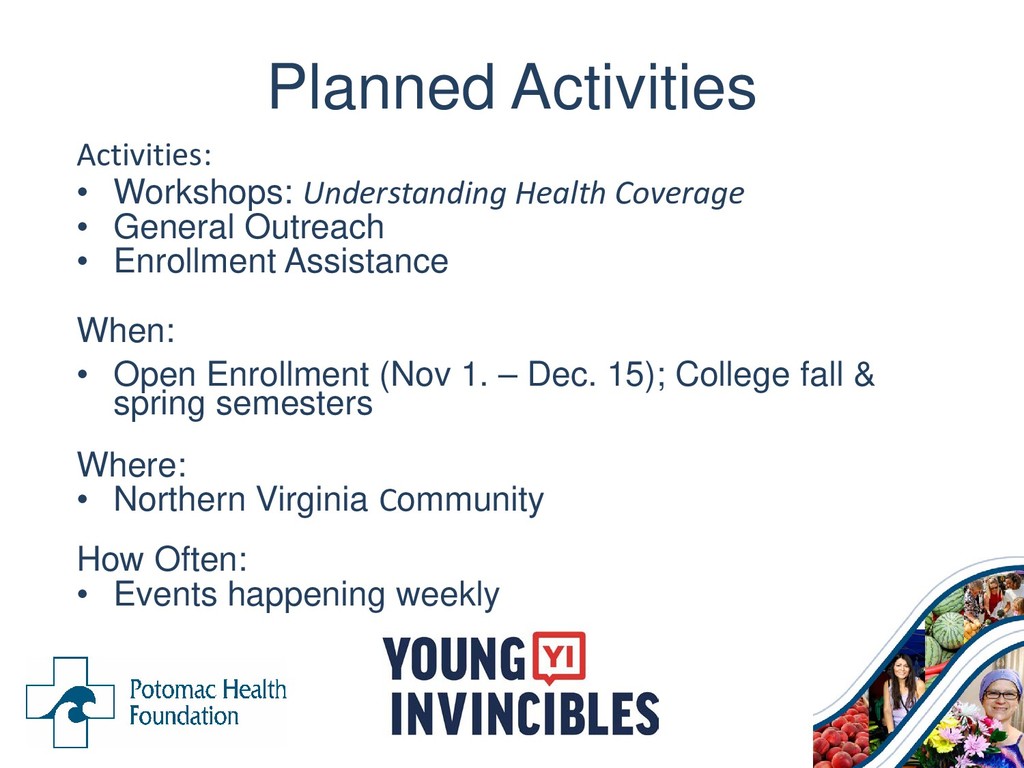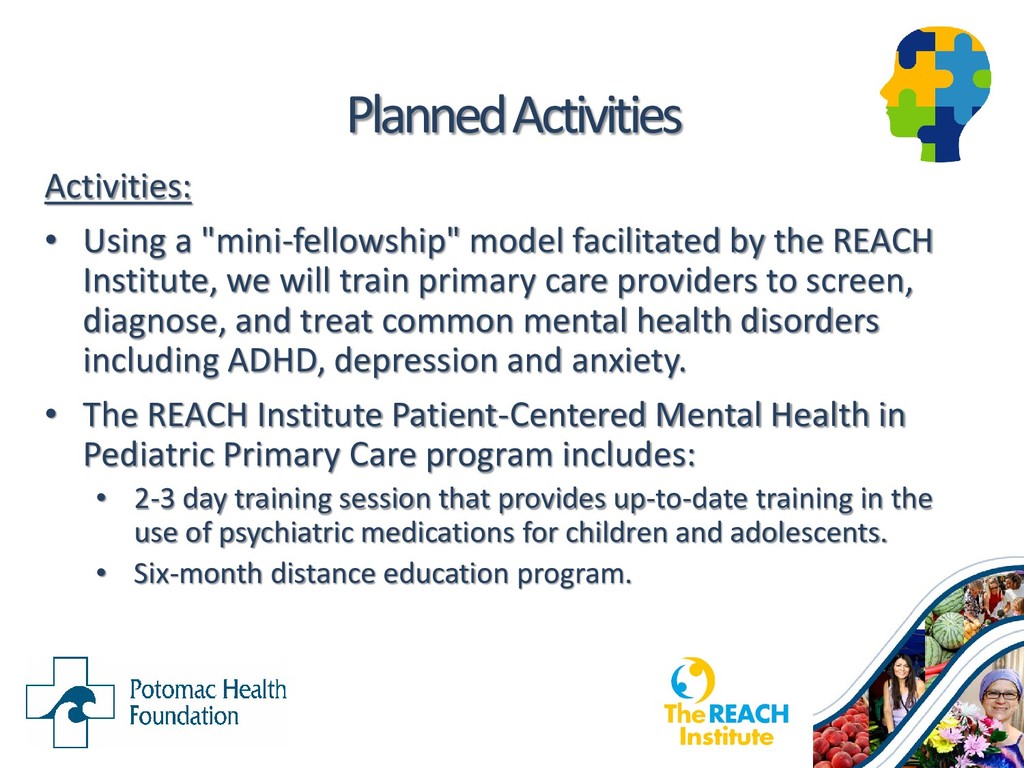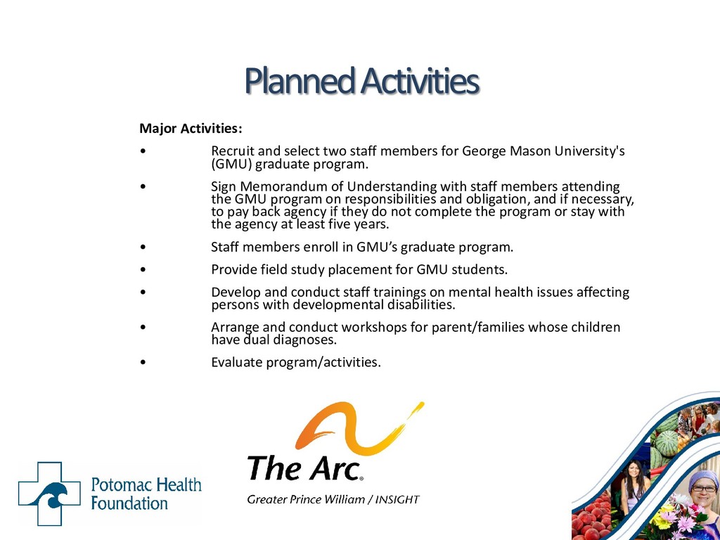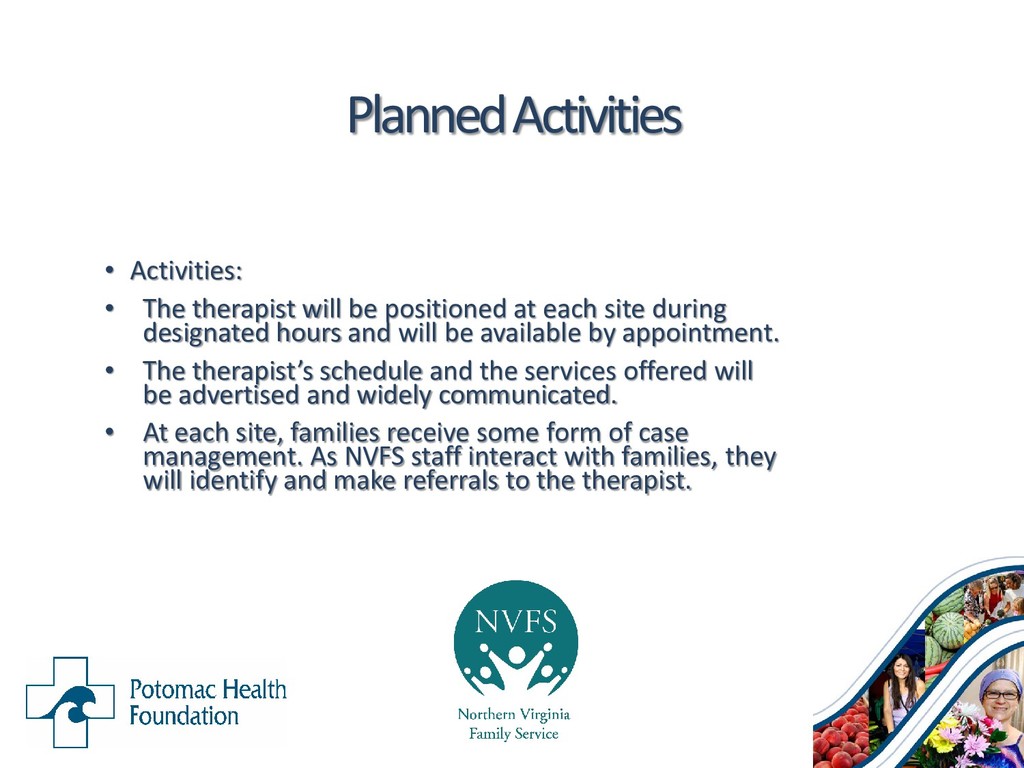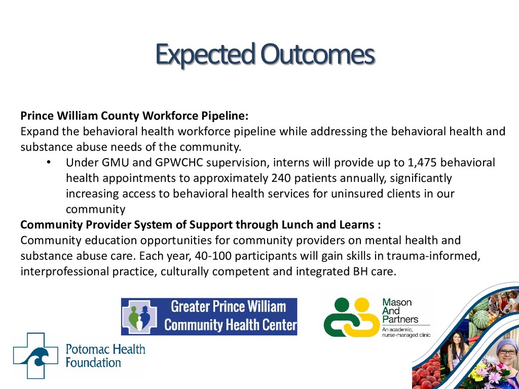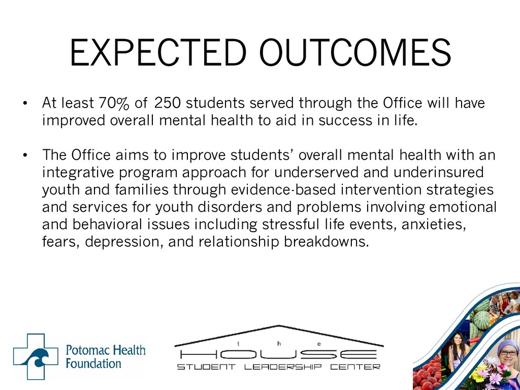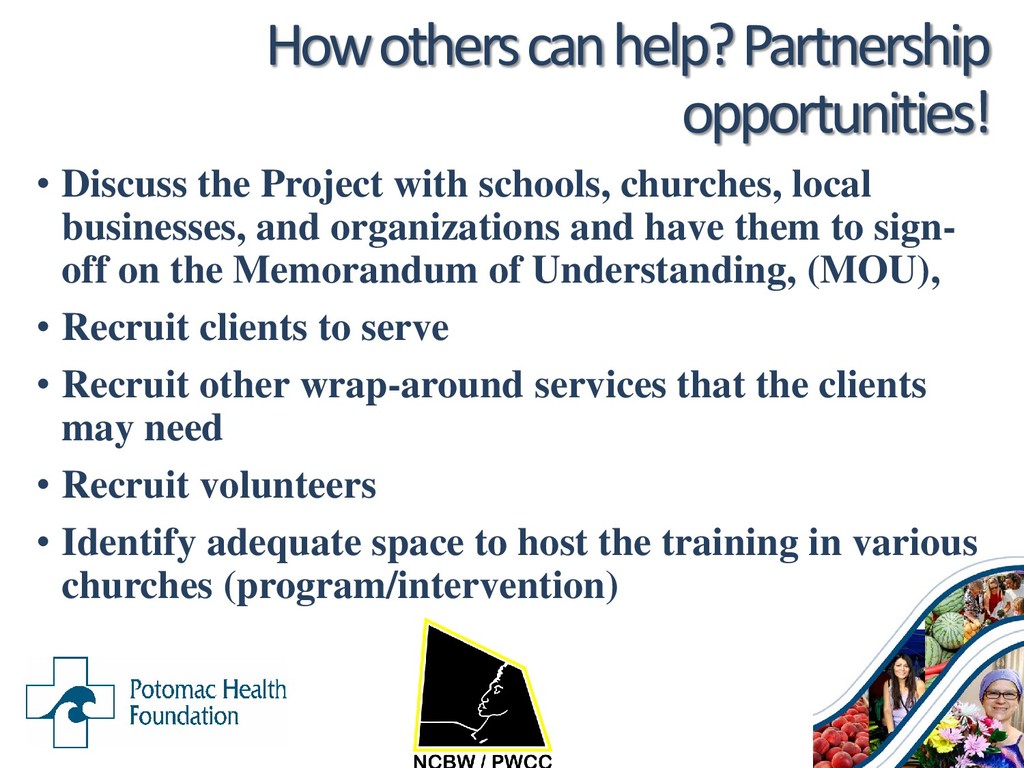 are going to do? • Implement six week modules developed by inter-professional teams of mental health experts on Brain Health, Substance Use/Abuse, School Violence, Healthy Relationships, Wellness, & Stress Mgmt • When? Throughout the 2018-2019 School year • Where? The program headquarters will be Graham Park Middle School. All 13 churches will be invited to participate. NCBW/PWCC will select 3 major church sites. The other churches will attend the closest site nearest to them. • The program will be modified as needed to gain success through evaluations • How Often • The scheduling of these activities will be determined once we meet with the professional teams, coordinator, principal, churches, health team, and others.