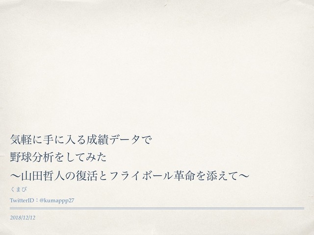 Special Thanks ✤ ࠓճੳ͢Δʹ͋ͨͬͯݩͱͳΔσʔλΛఏڙ͍ͯ͠ ͍ͨͩͨʢͱ͍͏͔ϦϯΫϑϦʔͩͬͨͷͰউखʹར ༻͍ͤͯͨ͞ʣʮσʔλͰָ͠Ήϓϩٿʯ༷ ✤ ϦϯΫɿhttp://baseballdata.jp/ ✤ શଧ੮σʔλΛ͡Ί༷ʑͳσʔλ͕ॆ࣮͍ͯ͠Δૉ