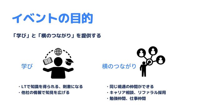 ・LTで知識を得られる、刺激になる ・他社の情報で知見を広げる 学び ・同じ境遇の仲間ができる ・キャリア相談、リファラル採用 ・勉強仲間、仕事仲間 横のつながり イベントの目的 「学び」と「横のつながり」を提供する
