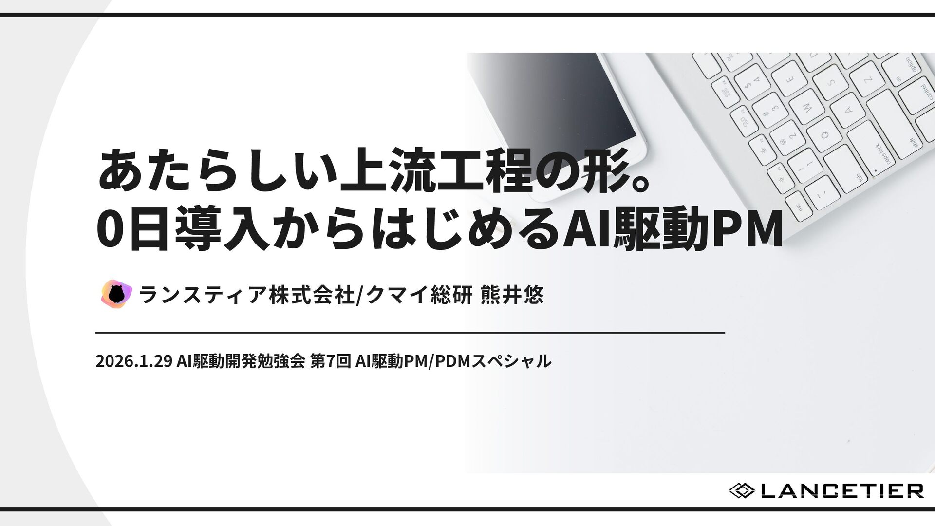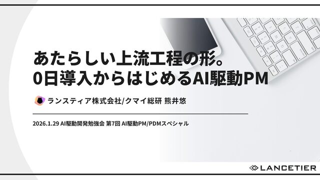 あたらしい上流工程の形。 0日導入からはじめるAI駆動PM ランスティア株式会社/クマイ総研 熊井悠 2026.1.29 AI駆動開発勉強会 第7回 AI駆動PM/PDMスペシャル