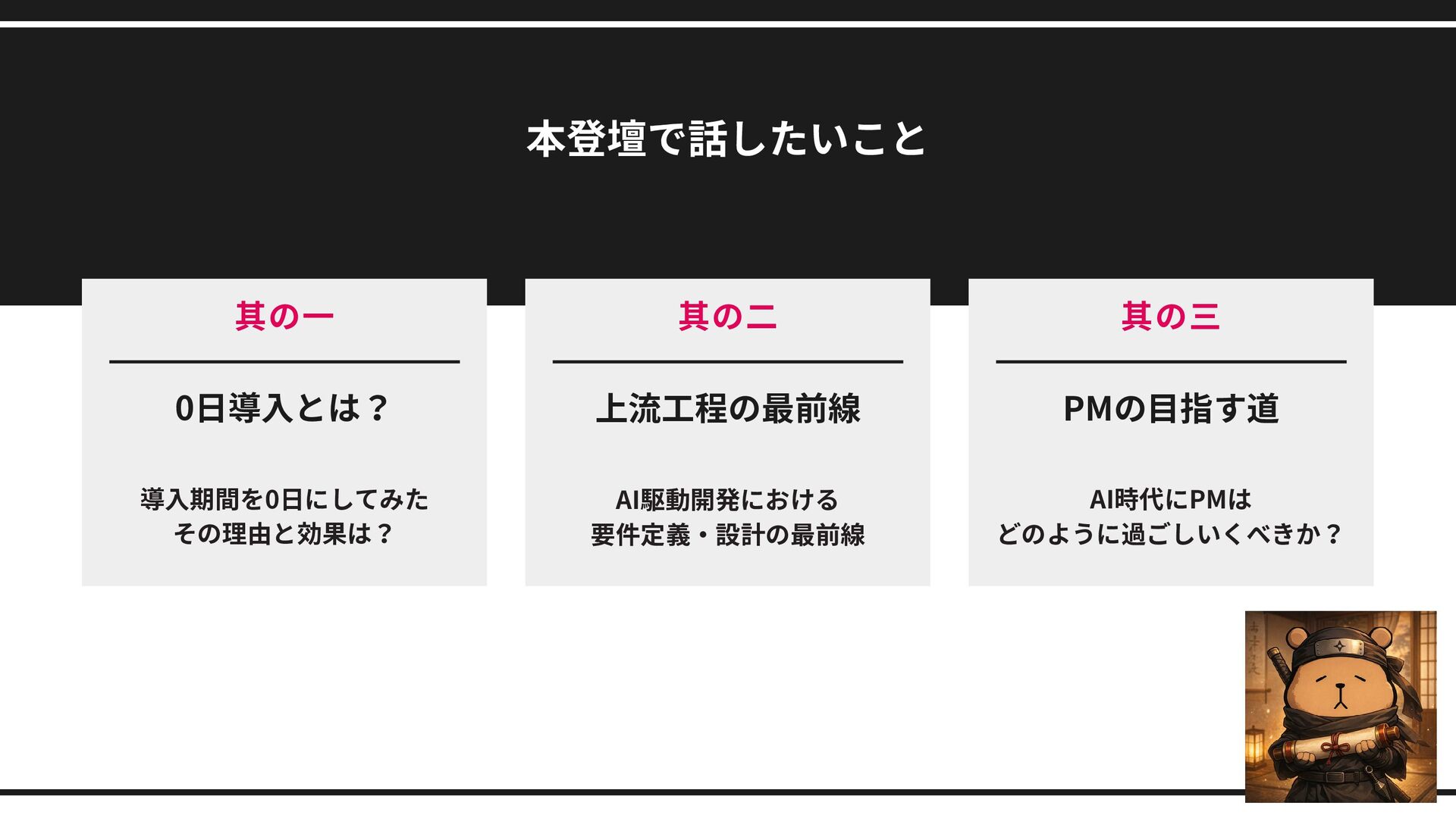 本登壇で話したいこと 導入期間を0日にしてみた その理由と効果は? 0日導入とは? AI駆動開発における 要件定義・設計の最前線 上流工程の最前線 AI時代にPMは どのように過ごしいくべきか? PMの目指す道
