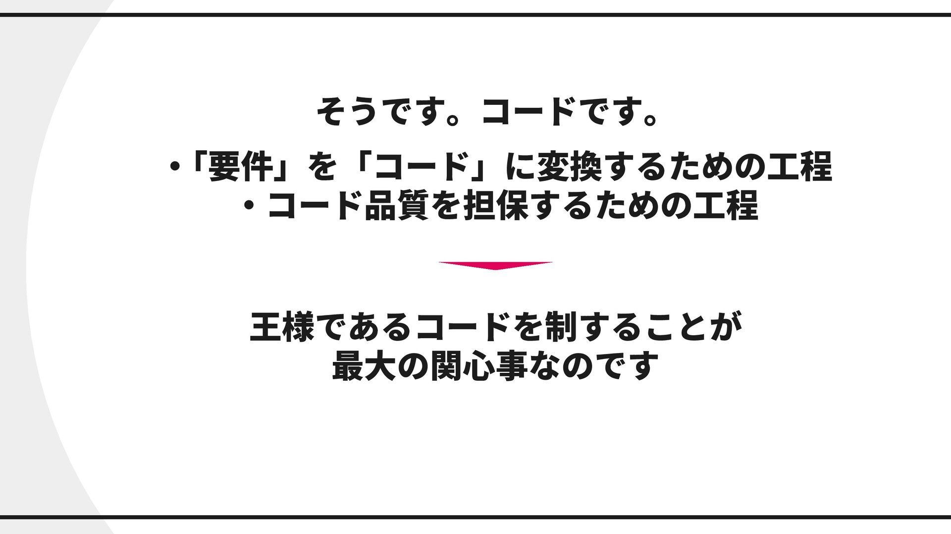 そうです。コードです。 ・ 「要件」を「コード」に変換するための工程 ・コード品質を担保するための工程 王様であるコードを制することが 最大の関心事なのです