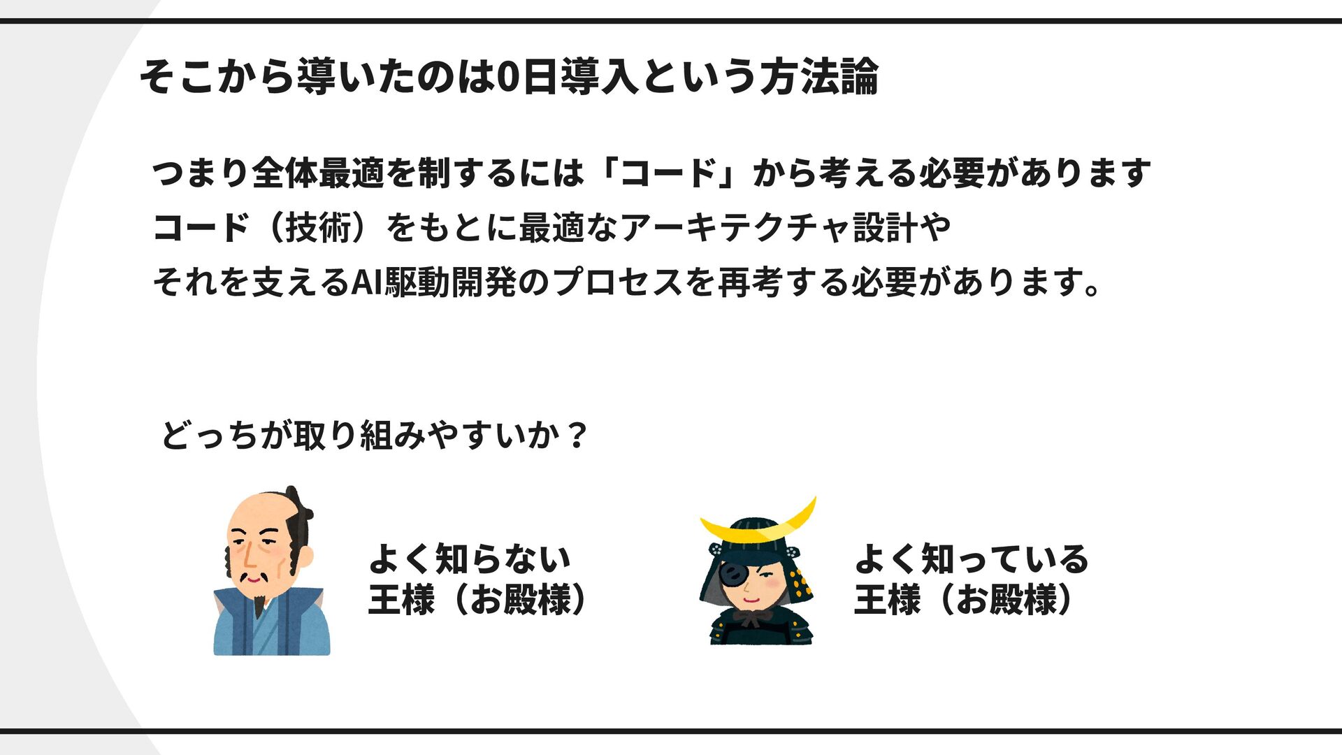 そこから導いたのは0日導入という方法論 よく知らない 王様(お殿様) よく知っている 王様(お殿様) つまり全体最適を制するには「コード」から考える必要があります コード(技術)をもとに最適なアーキテクチャ設計や それを支えるAI駆動開発のプロセスを再考する必要があります。 どっちが取り組みやすいか?