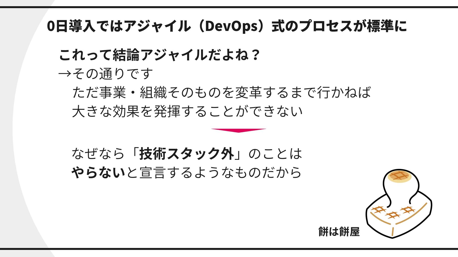 0日導入ではアジャイル(DevOps)式のプロセスが標準に これって結論アジャイルだよね? →その通りです ただ事業・組織そのものを変革するまで行かねば 大きな効果を発揮することができない なぜなら「技術スタック外」のことは やらないと宣言するようなものだから 餅は餅屋