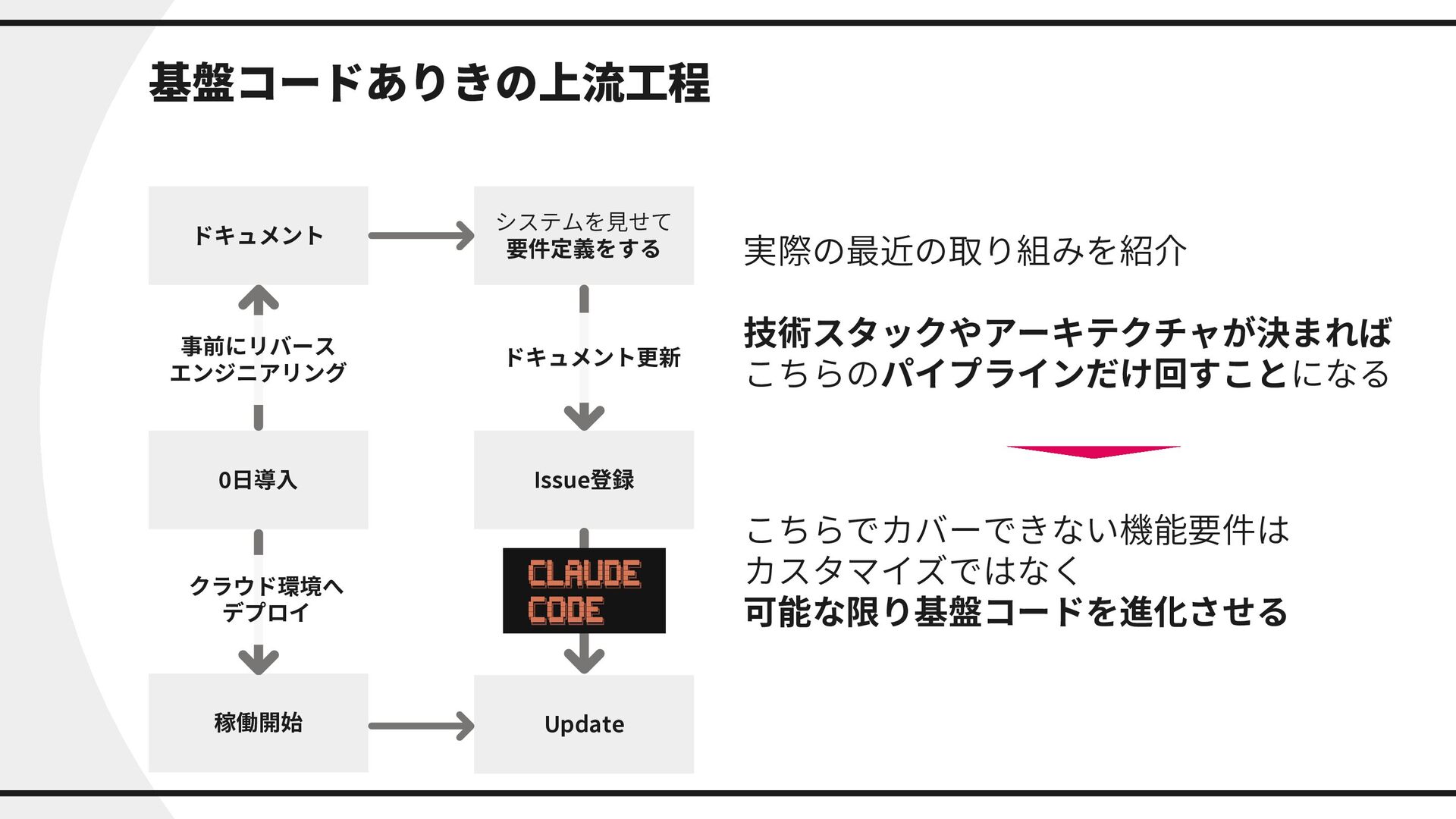 事前にリバース エンジニアリング ドキュメント クラウド環境へ デプロイ 基盤コードありきの上流工程 実際の最近の取り組みを紹介 技術スタックやアーキテクチャが決まれば こちらのパイプラインだけ回すことになる 0日導入