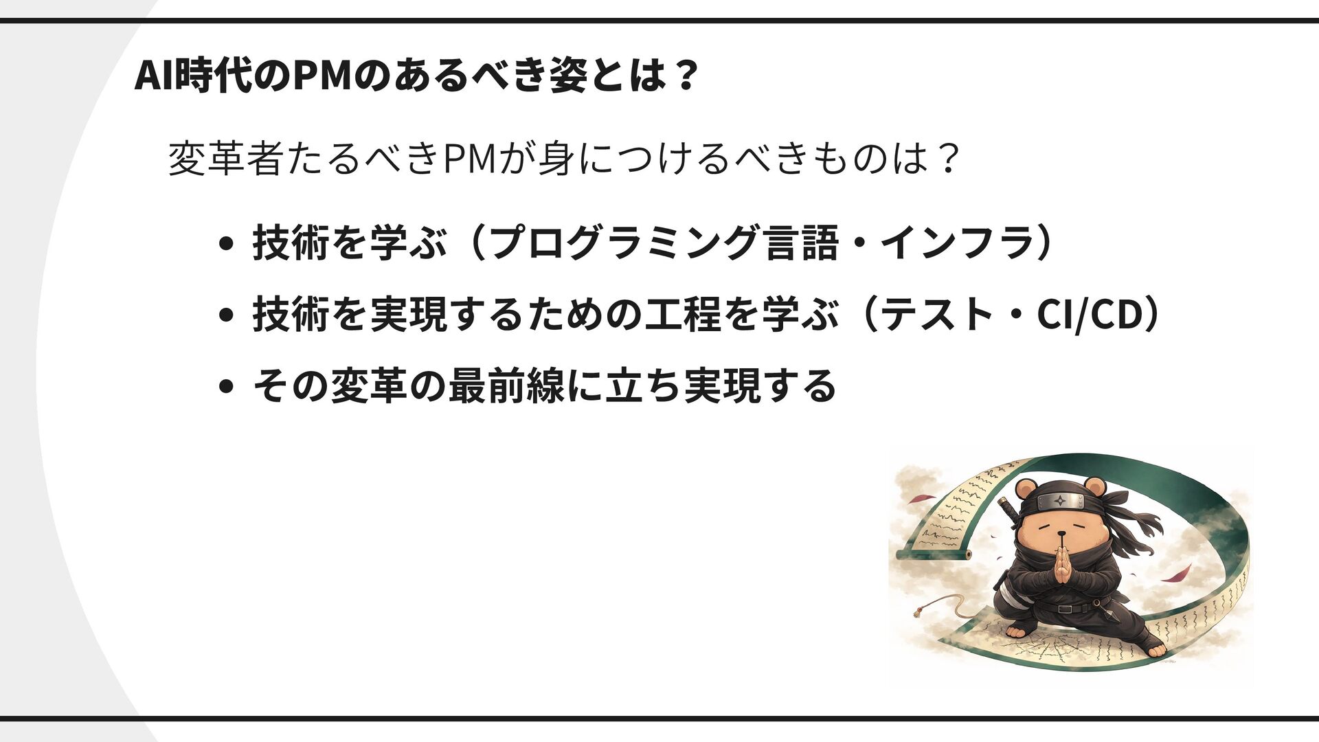 AI時代のPMのあるべき姿とは? 変革者たるべきPMが身につけるべきものは? 技術を学ぶ(プログラミング言語・インフラ) 技術を実現するための工程を学ぶ(テスト・CI/CD) その変革の最前線に立ち実現する