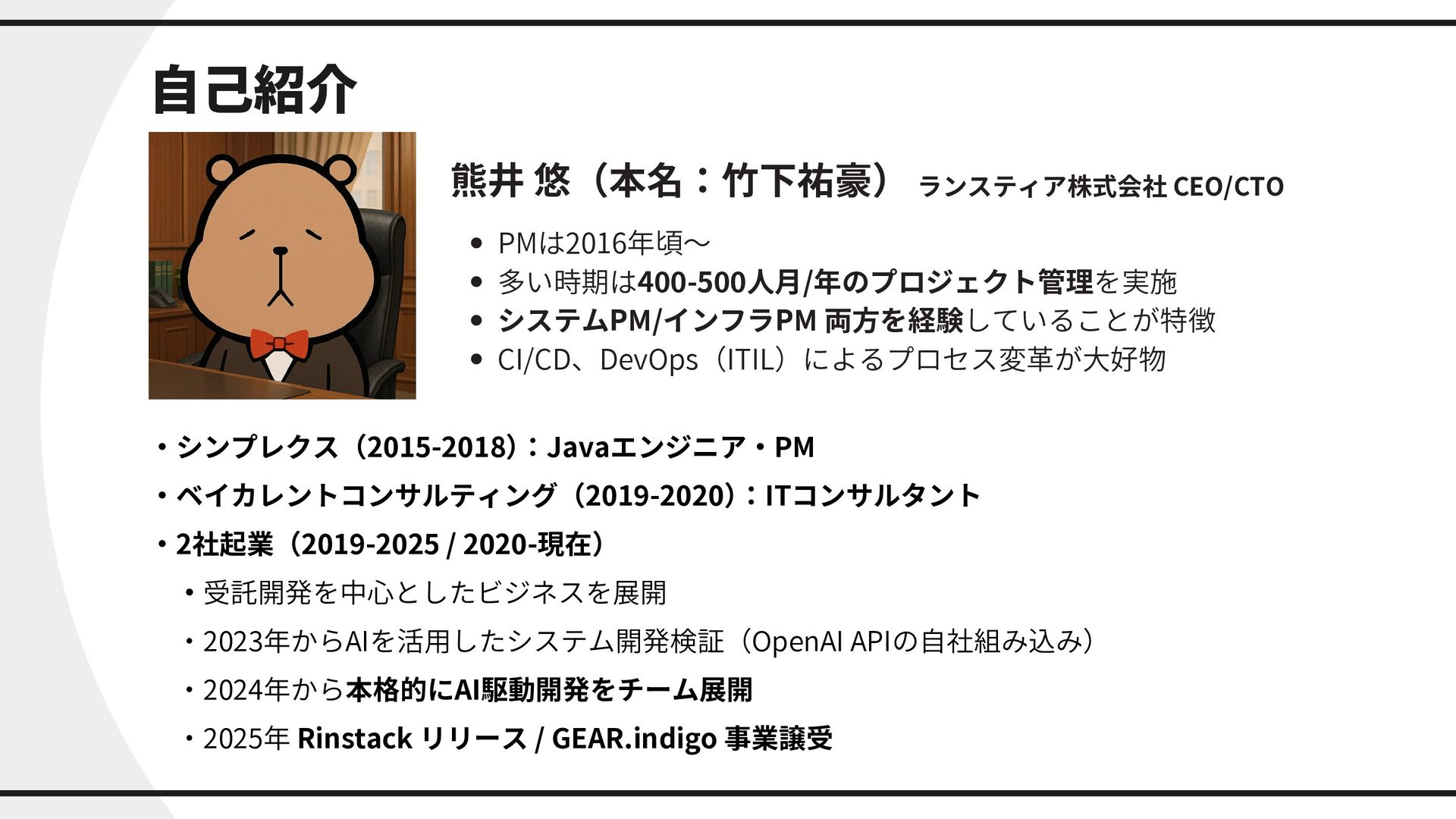 / 2020-現在) ・受託開発を中心としたビジネスを展開 ・2023年からAIを活用したシステム開発検証(OpenAI APIの自社組み込み) ・2024年から本格的にAI駆動開発をチーム展開 ・2025年 Rinstack リリース / GEAR.indigo 事業譲受 PMは2016年頃〜 多い時期は400-500人月/年のプロジェクト管理を実施 システムPM/インフラPM 両方を経験していることが特徴 CI/CD、DevOps(ITIL)によるプロセス変革が大好物