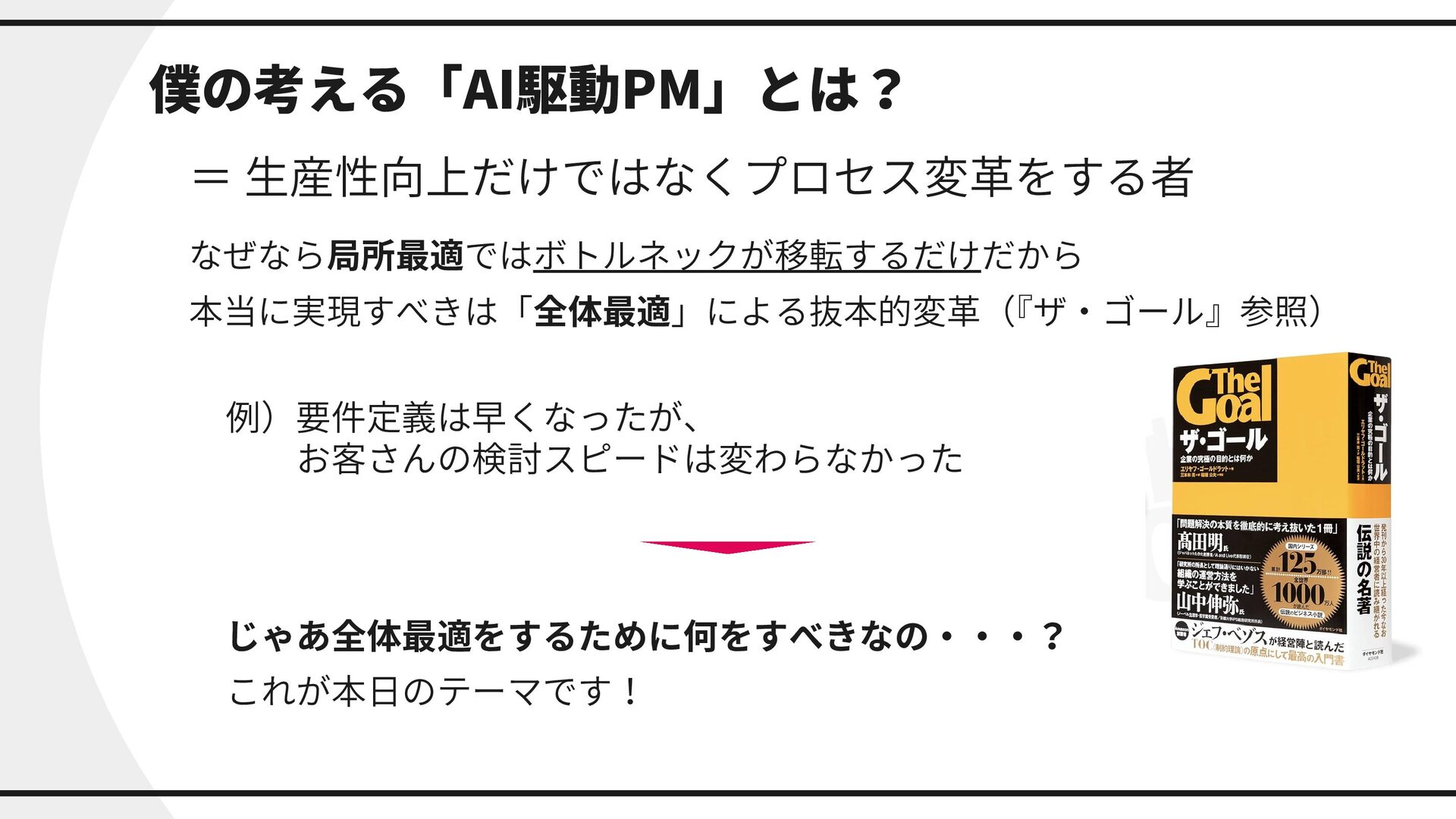 僕の考える「AI駆動PM」とは? = 生産性向上だけではなくプロセス変革をする者 なぜなら局所最適ではボトルネックが移転するだけだから 本当に実現すべきは「全体最適」による抜本的変革( 『ザ・ゴール』参照) じゃあ全体最適をするために何をすべきなの・・・? これが本日のテーマです! 例)要件定義は早くなったが、 お客さんの検討スピードは変わらなかった