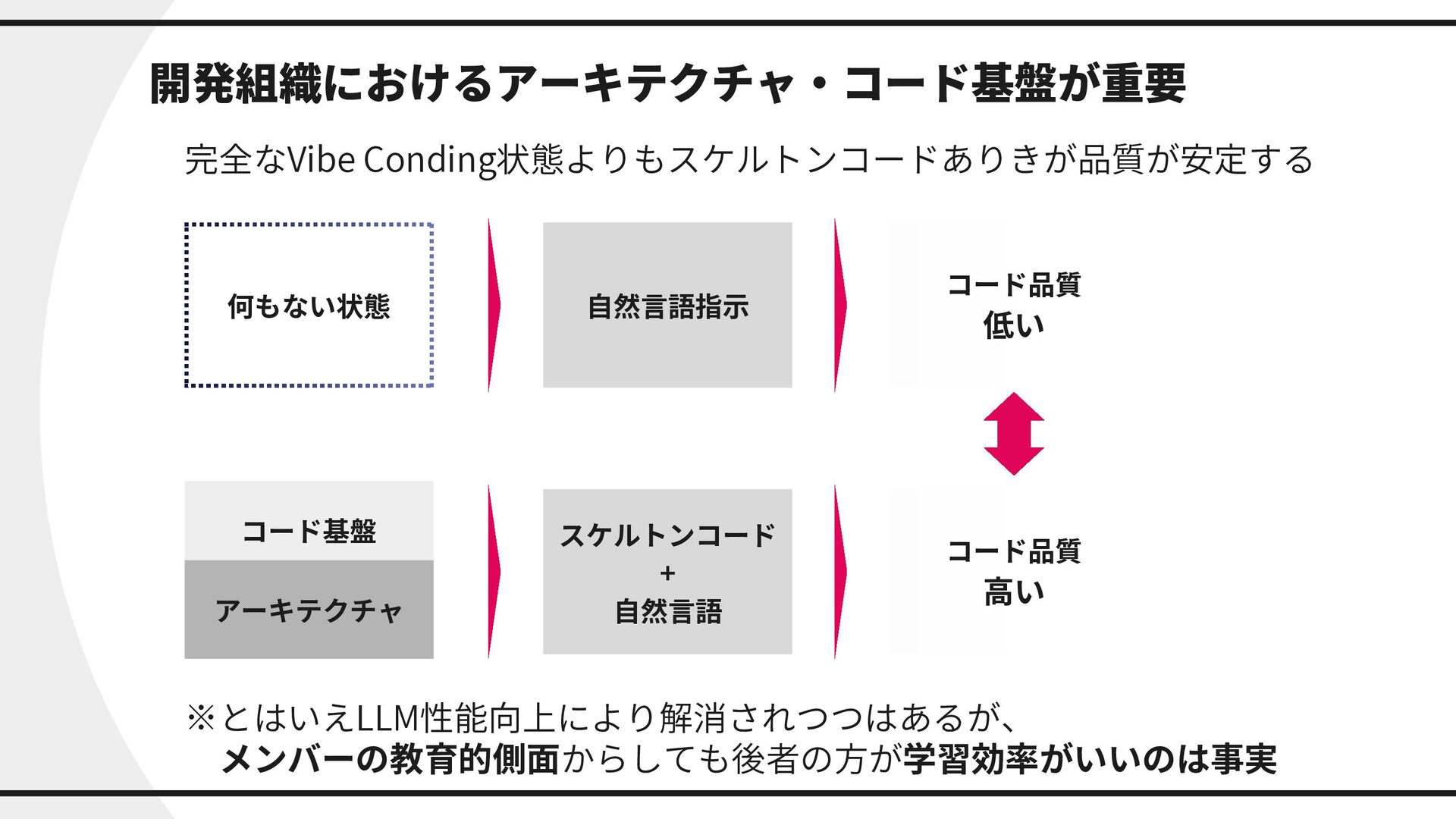 高い 開発組織におけるアーキテクチャ・コード基盤が重要 完全なVibe Conding状態よりもスケルトンコードありきが品質が安定する ※とはいえLLM性能向上により解消されつつはあるが、 メンバーの教育的側面からしても後者の方が学習効率がいいのは事実