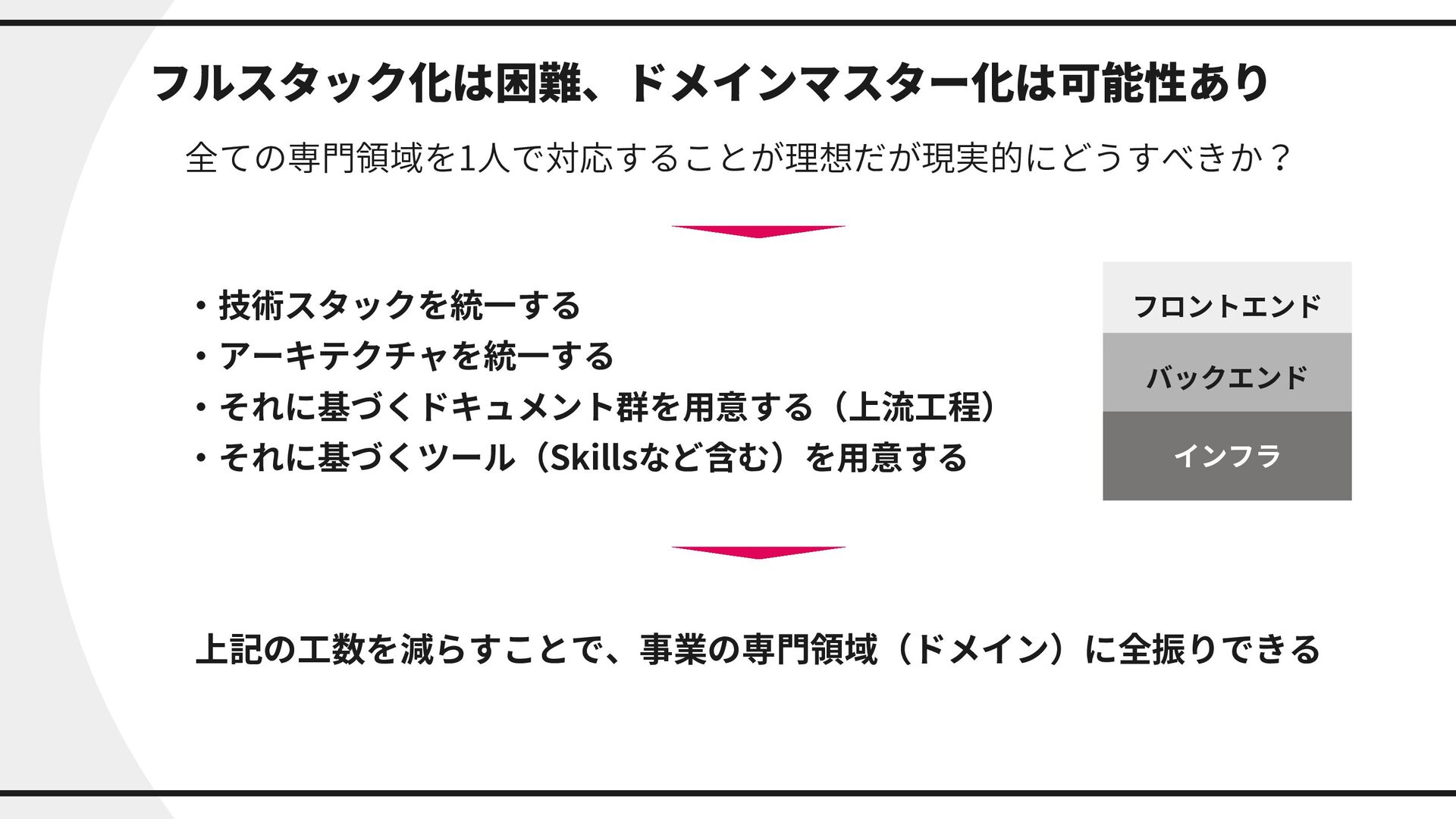 フルスタック化は困難、ドメインマスター化は可能性あり フロントエンド バックエンド インフラ ・技術スタックを統一する ・アーキテクチャを統一する ・それに基づくドキュメント群を用意する(上流工程) ・それに基づくツール(Skillsなど含む)を用意する 上記の工数を減らすことで、事業の専門領域(ドメイン)に全振りできる 全ての専門領域を1人で対応することが理想だが現実的にどうすべきか?