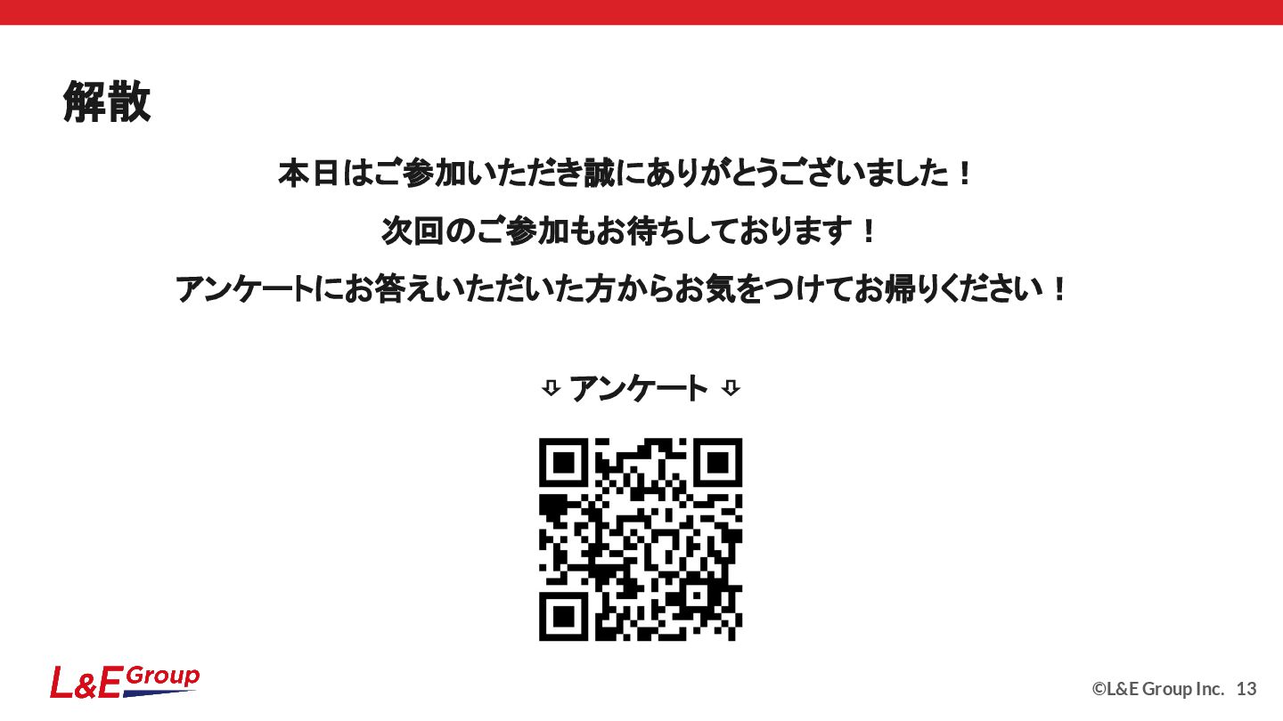 解散 ©L&E Group Inc. 13 本日はご参加いただき誠にありがとうございました! 次回のご参加もお待ちしております! アンケートにお答えいただいた方からお気をつけてお帰りください! ⇩ アンケート ⇩