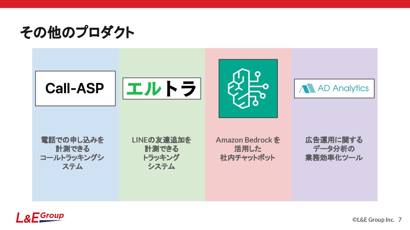 その他のプロダクト ©L&E Group Inc. 7 電話での申し込みを 計測できる コールトラッキングシ ステム Amazon Bedrock