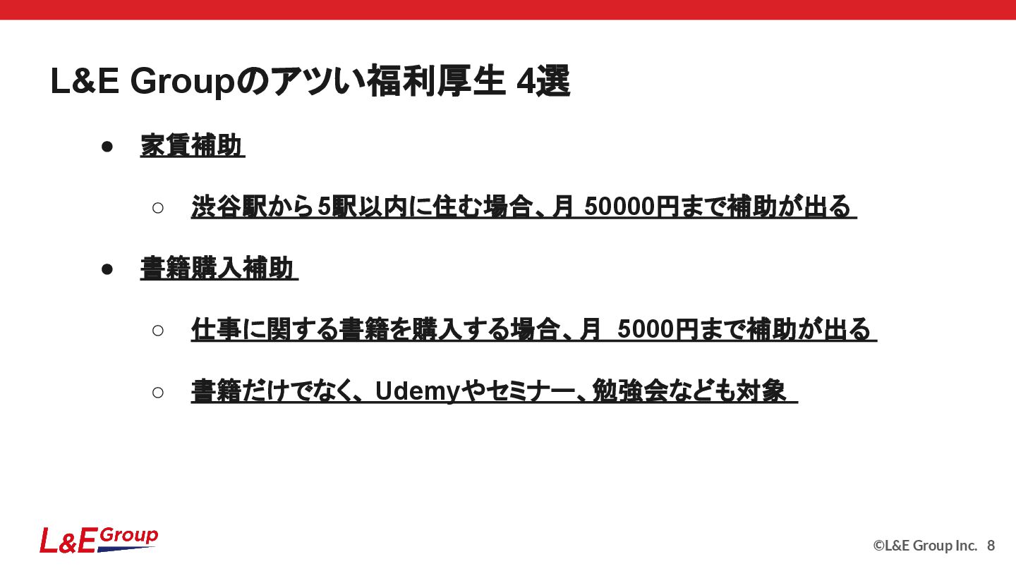 L&E Groupのアツい福利厚生 4選 ©L&E Group Inc. 8 • 家賃補助 ◦ 渋谷駅から