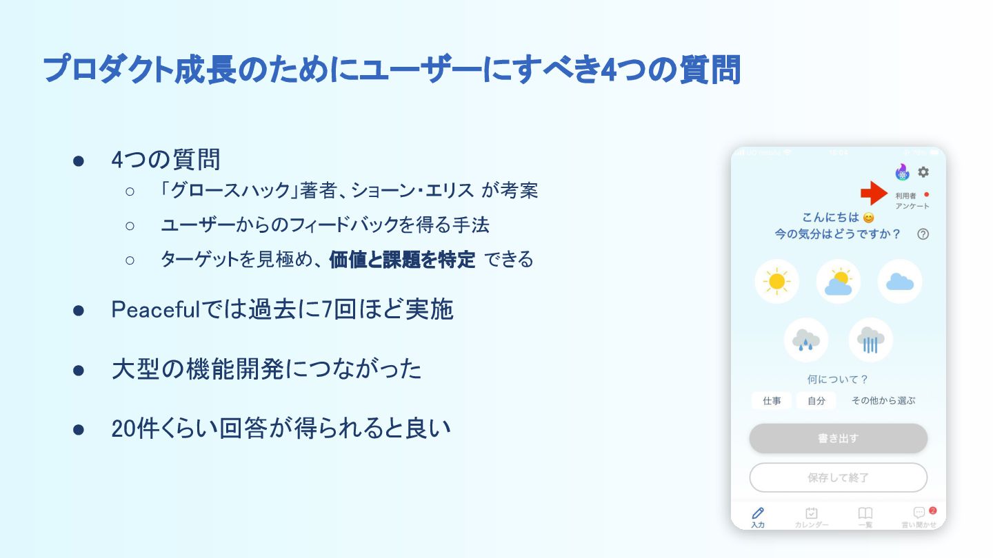 ショーン・エリスが考案したPMFを手繰り寄せるためのユーザーフィードバック手法を、メンタルケアアプリ「Peaceful」にて過去7回ほど実施した事例を紹介します。