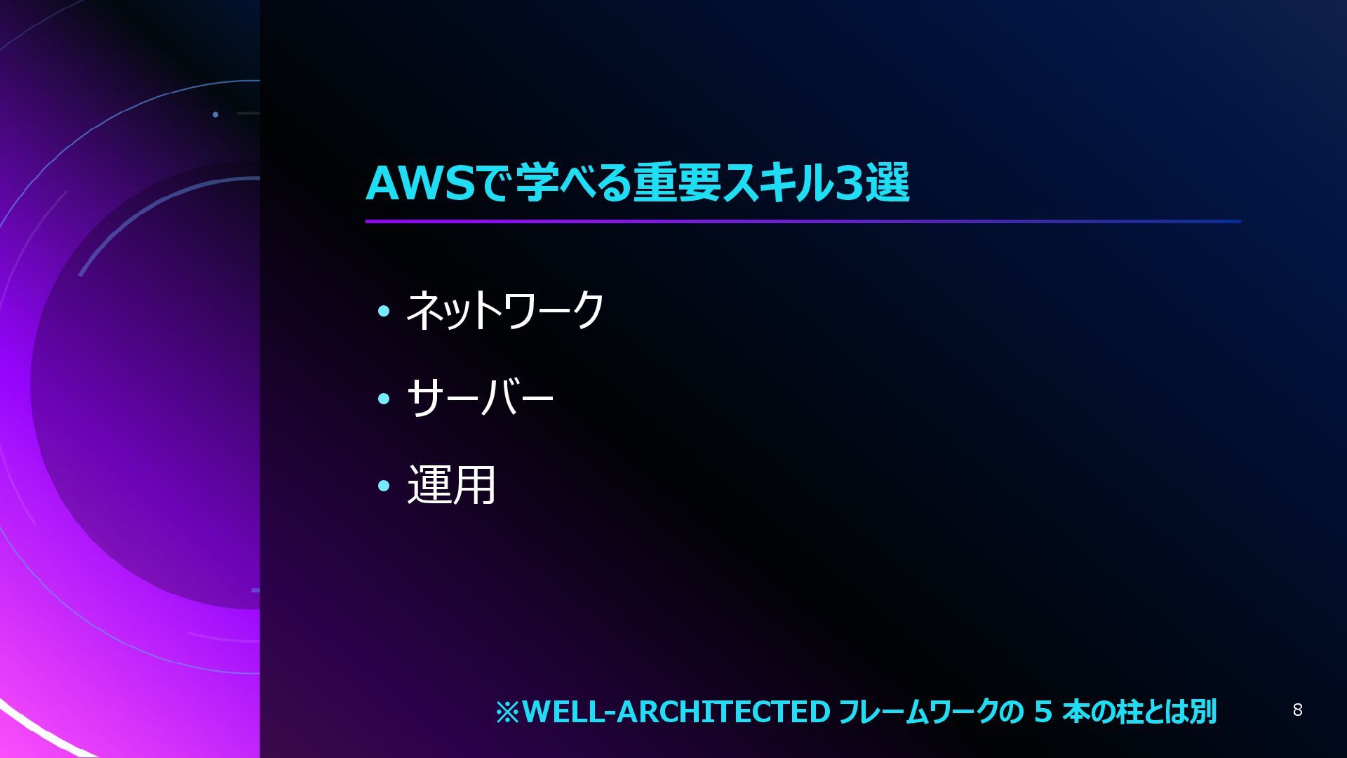 AWSで学べる重要スキル3選 • ネットワーク • サーバー • 運用 8 ※WELL-ARCHITECTED フレームワークの