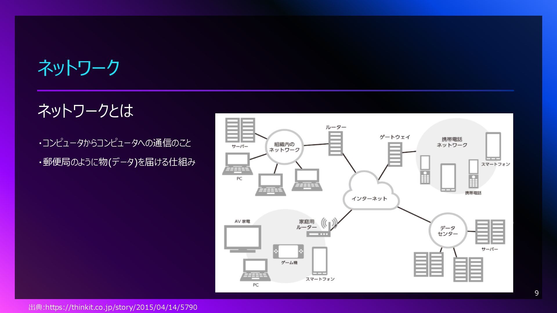 ネットワーク 9 ネットワークとは ・コンピュータからコンピュータへの通信のこと ・郵便局のように物(データ)を届ける仕組み 出典:https://thinkit.co.jp/story/2015/04/14/5790