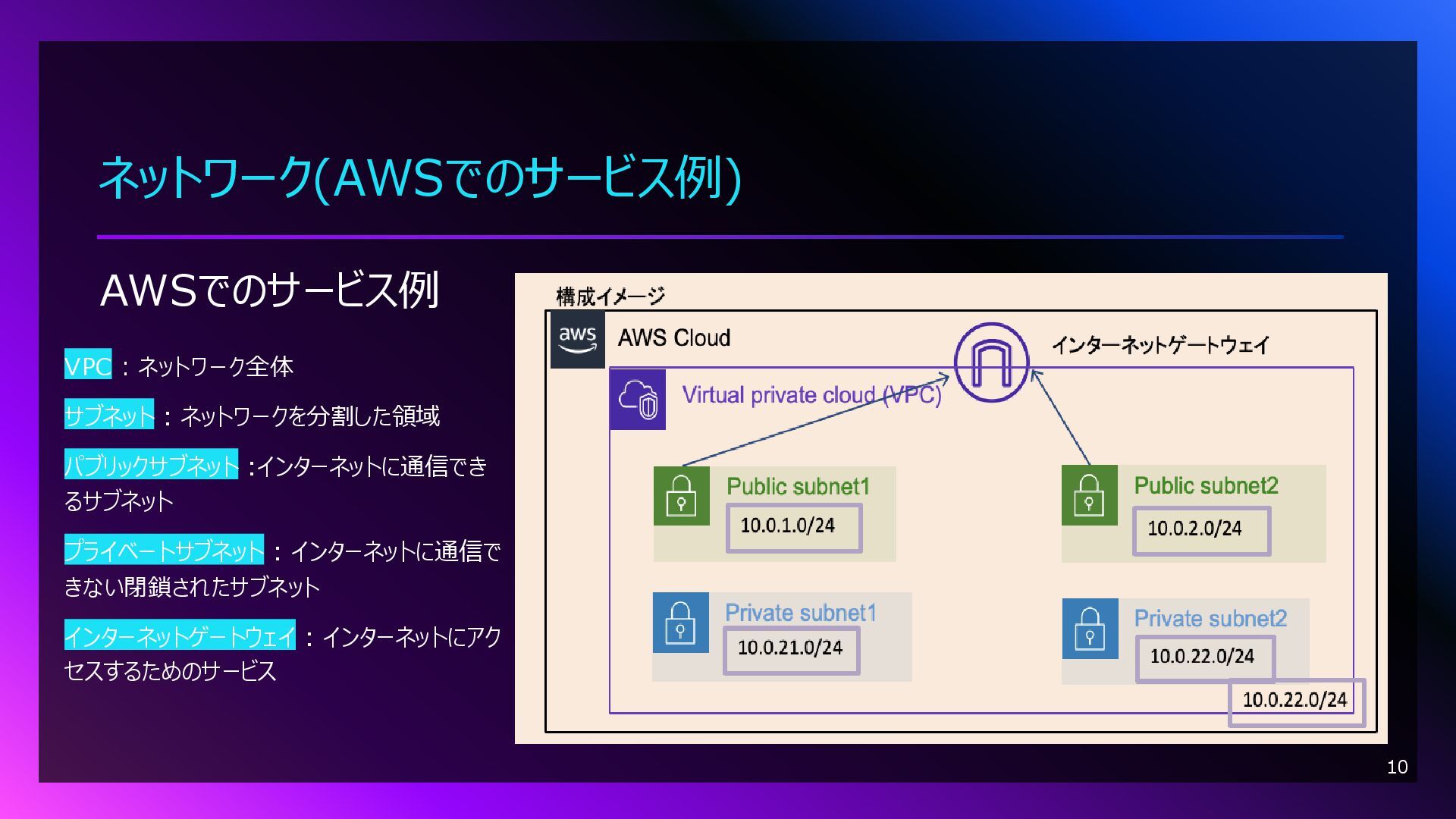 :インターネットに通信でき るサブネット プライベートサブネット : インターネットに通信で きない閉鎖されたサブネット インターネットゲートウェイ : インターネットにアク セスするためのサービス