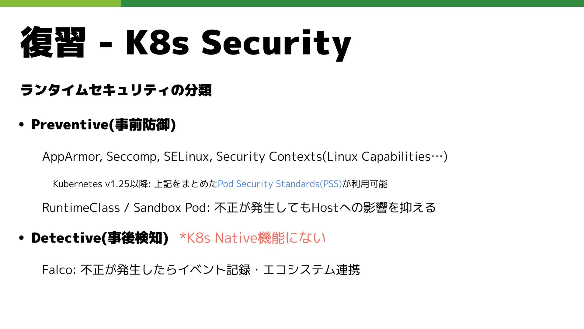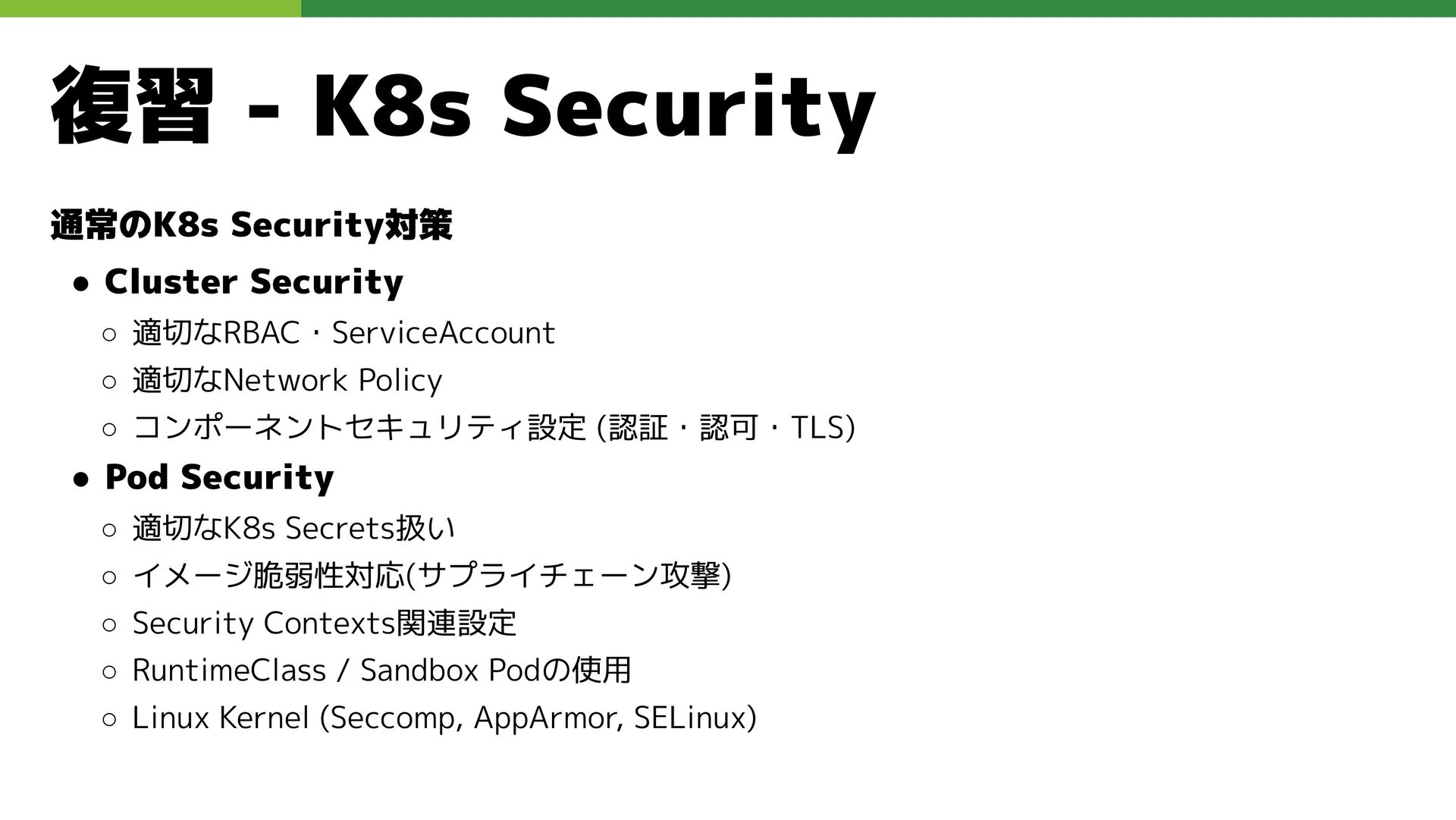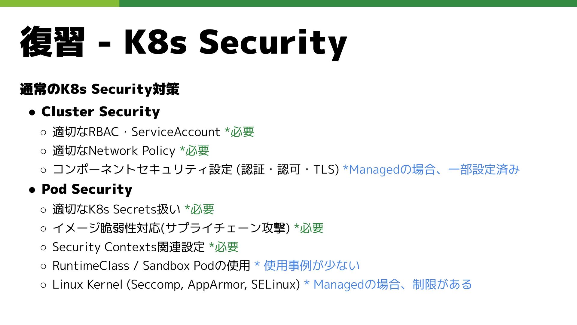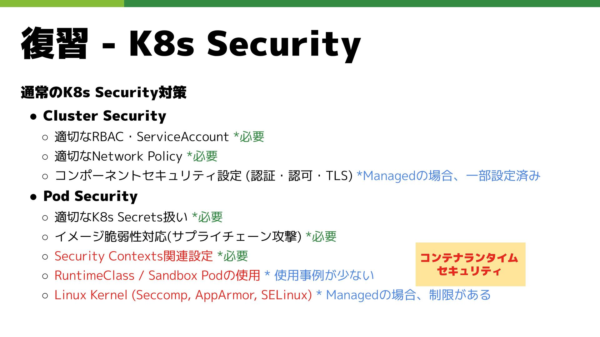 適切なRBAC・ServiceAccount *必要 ◦ 適切なNetwork Policy *必要 ◦ コンポーネントセキュリティ設定 (認証・認可・TLS) *Managedの場合、一部設定済み • Pod Security ◦ 適切なK8s Secrets扱い *必要 ◦ イメージ脆弱性対応(サプライチェーン攻撃) *必要 ◦ Security Contexts関連設定 *必要 ◦ RuntimeClass / Sandbox Podの使用 * 使用事例が少ない ◦ Linux Kernel (Seccomp, AppArmor, SELinux) * Managedの場合、制限がある コンテナランタイム セキュリティ