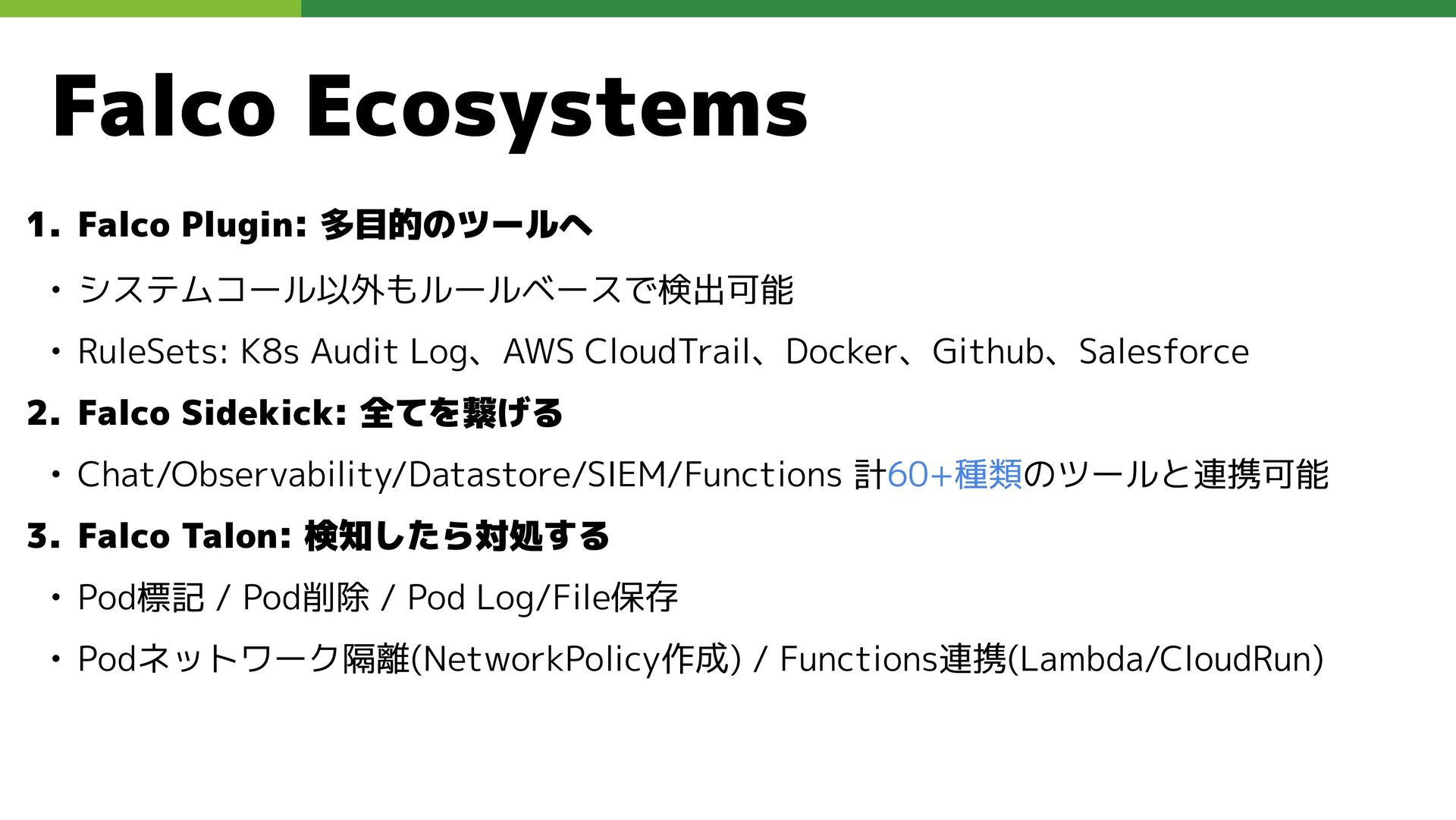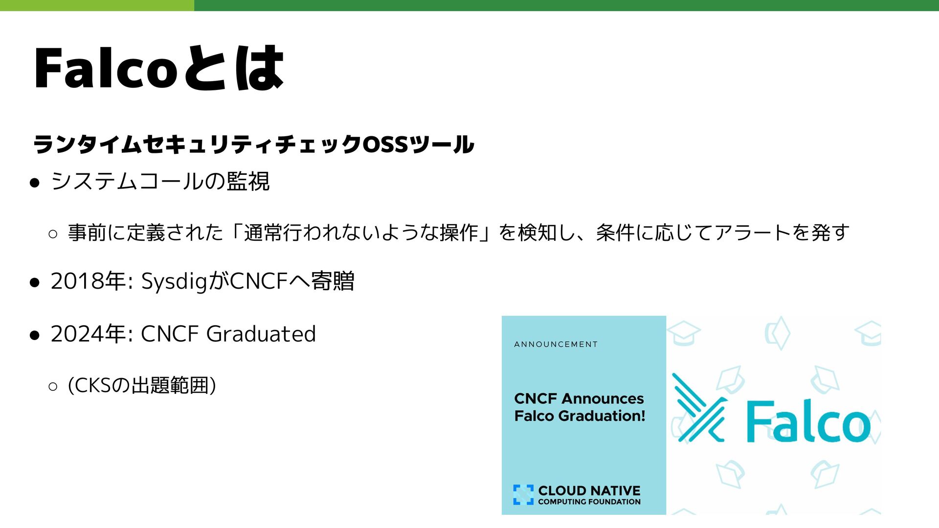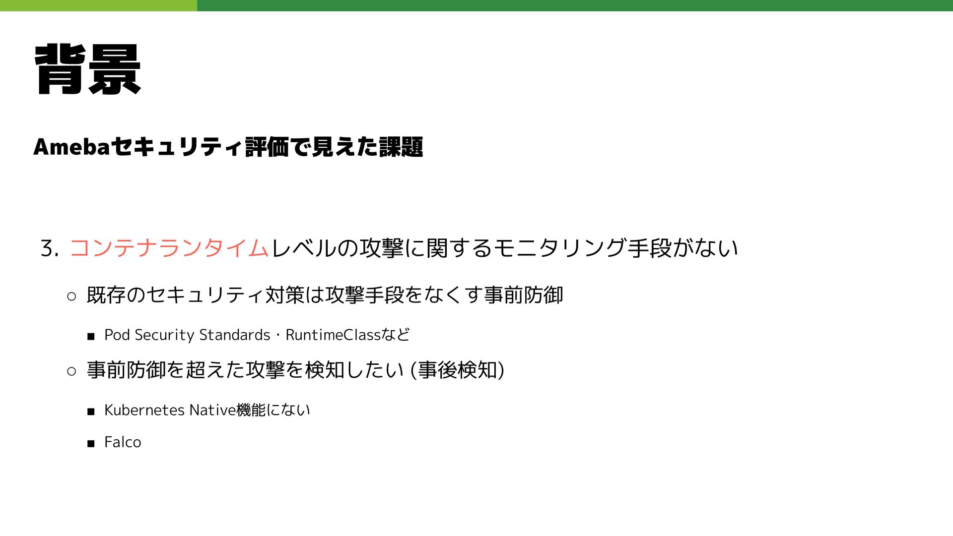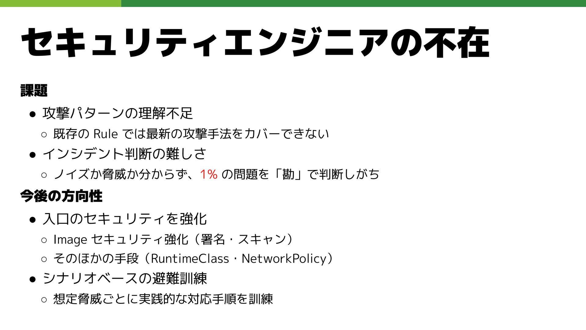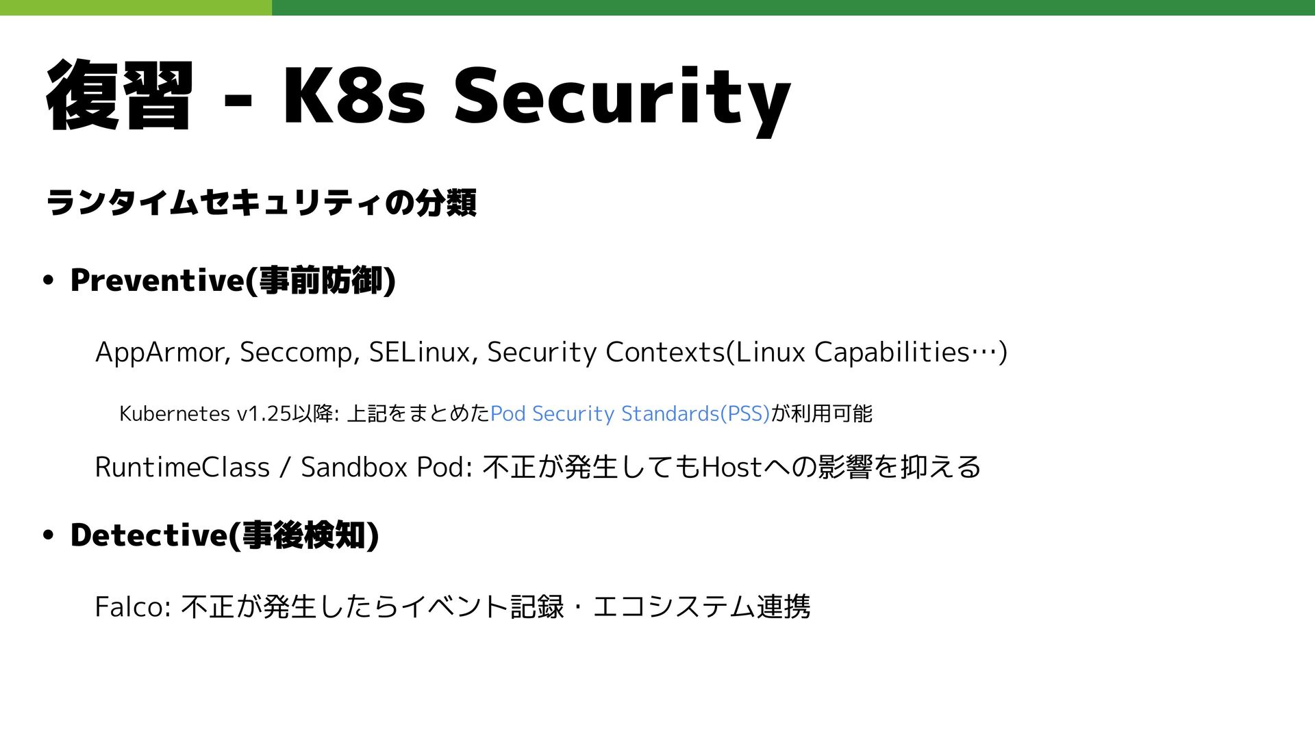 適切なRBAC・ServiceAccount *必要 ◦ 適切なNetwork Policy *必要 ◦ コンポーネントセキュリティ設定 (認証・認可・TLS) *Managedの場合、一部設定済み • Pod Security ◦ 適切なK8s Secrets扱い *必要 ◦ イメージ脆弱性対応(サプライチェーン攻撃) *必要 ◦ Security Contexts関連設定 *必要 ◦ RuntimeClass / Sandbox Podの使用 * 使用事例が少ない ◦ Linux Kernel (Seccomp, AppArmor, SELinux) * Managedの場合、制限がある コンテナランタイム セキュリティ