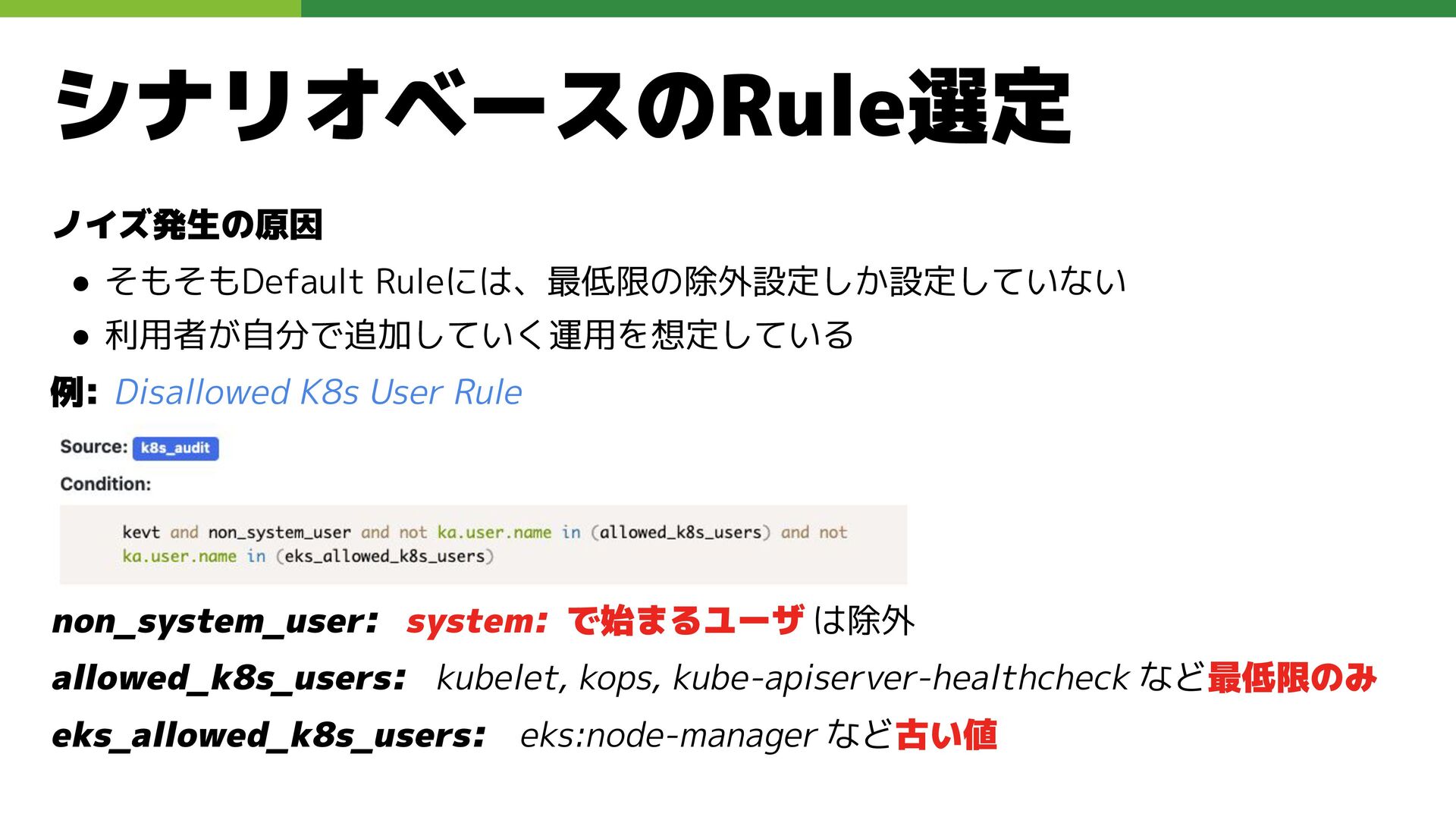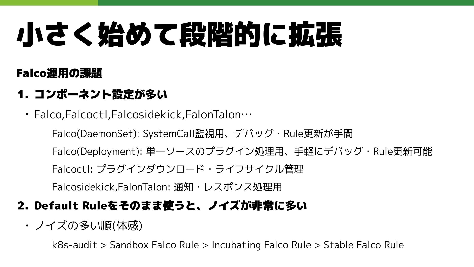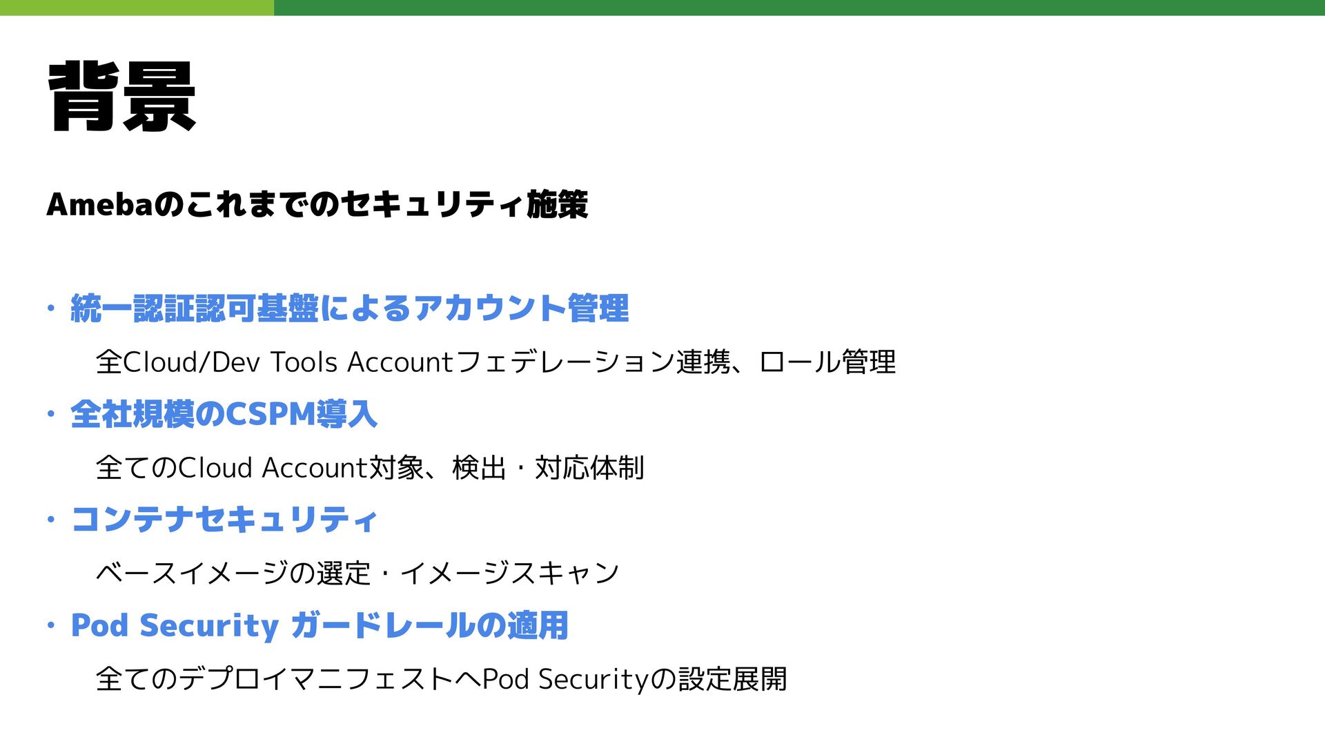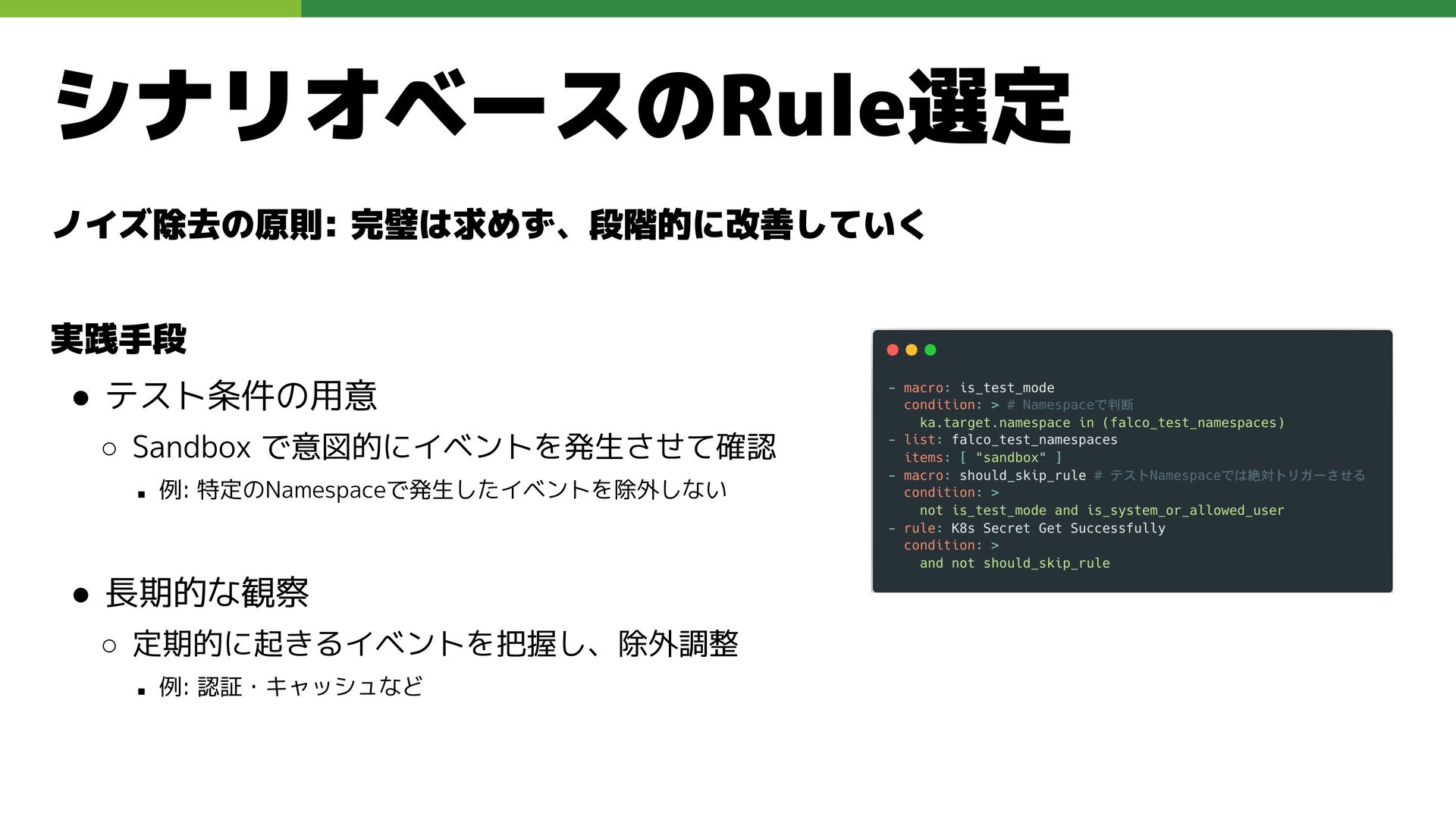 適切なRBAC・ServiceAccount *必要 ◦ 適切なNetwork Policy *必要 ◦ コンポーネントセキュリティ設定 (認証・認可・TLS) *Managedの場合、一部設定済み • Pod Security ◦ 適切なK8s Secrets扱い *必要 ◦ イメージ脆弱性対応(サプライチェーン攻撃) *必要 ◦ Security Contexts関連設定 *必要 ◦ RuntimeClass / Sandbox Podの使用 * 使用事例が少ない ◦ Linux Kernel (Seccomp, AppArmor, SELinux) * Managedの場合、制限がある コンテナランタイム セキュリティ