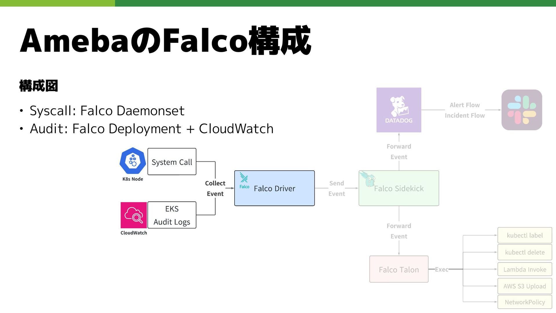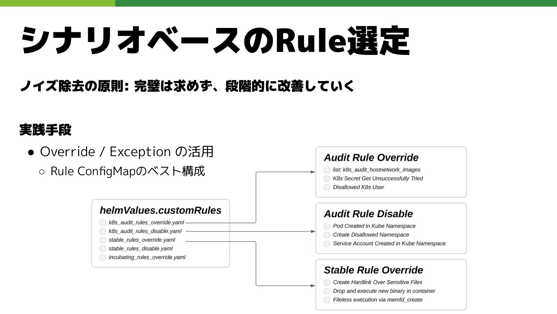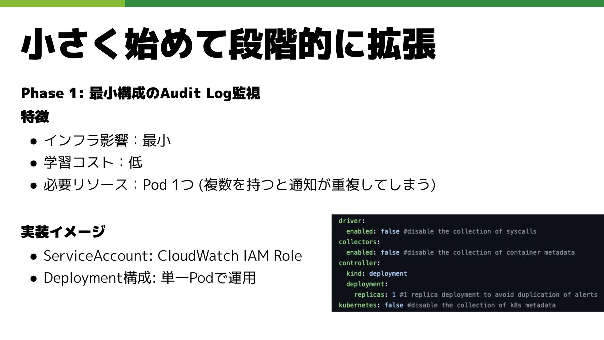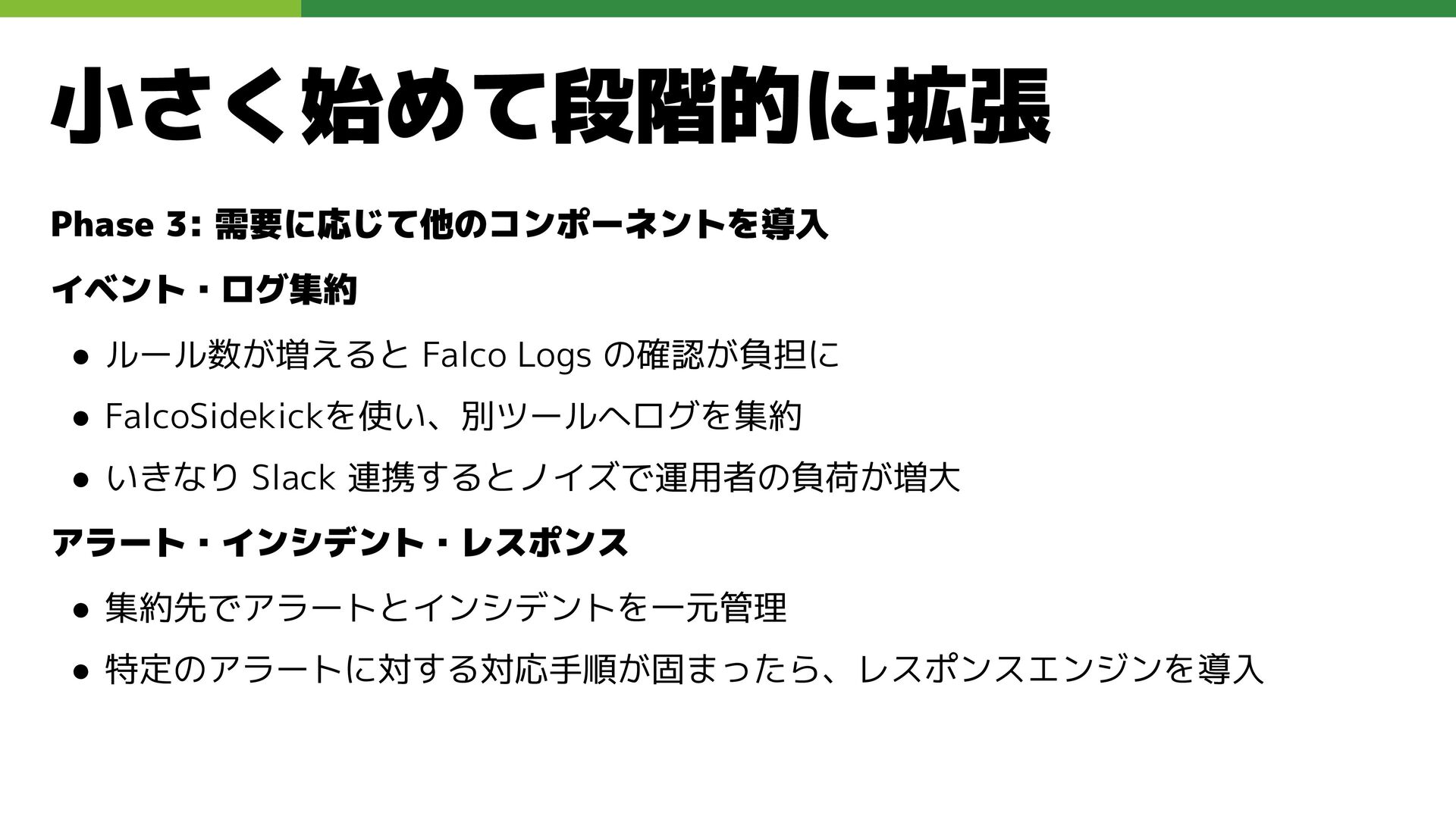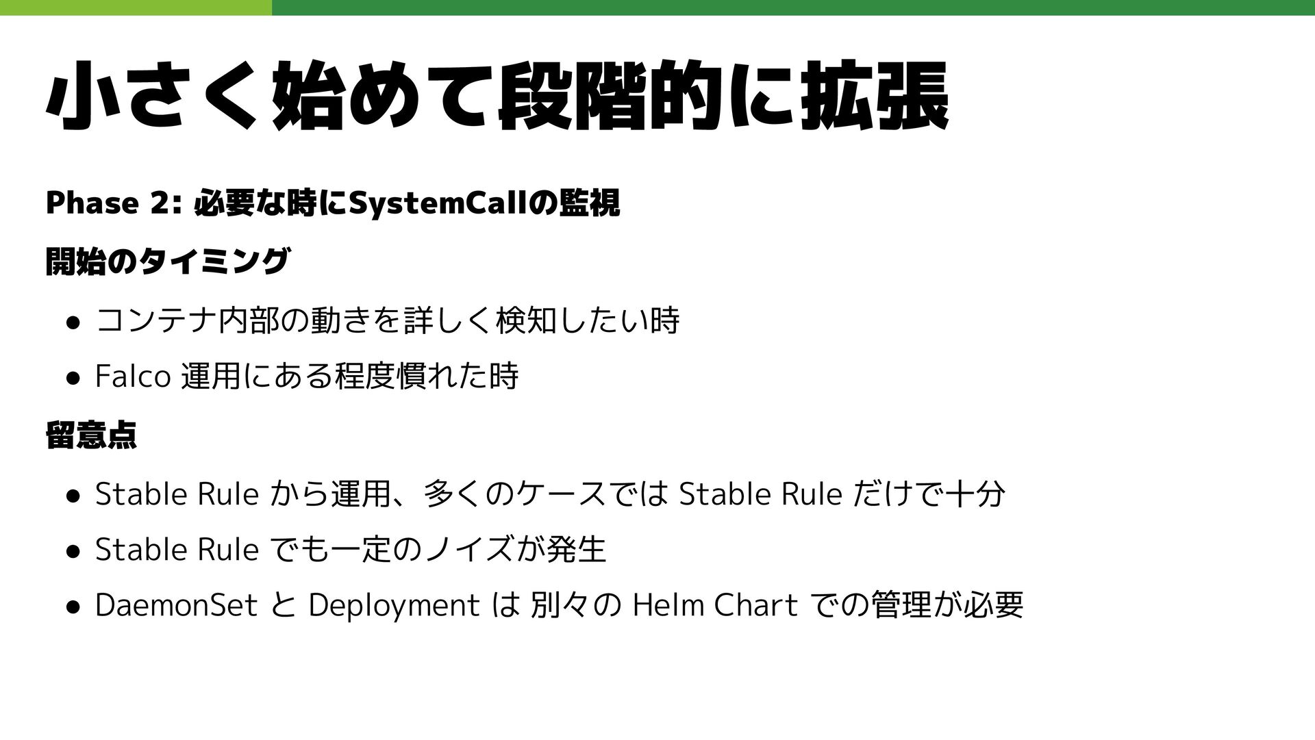 適切なRBAC・ServiceAccount *必要 ◦ 適切なNetwork Policy *必要 ◦ コンポーネントセキュリティ設定 (認証・認可・TLS) *Managedの場合、一部設定済み • Pod Security ◦ 適切なK8s Secrets扱い *必要 ◦ イメージ脆弱性対応(サプライチェーン攻撃) *必要 ◦ Security Contexts関連設定 *必要 ◦ RuntimeClass / Sandbox Podの使用 * 使用事例が少ない ◦ Linux Kernel (Seccomp, AppArmor, SELinux) * Managedの場合、制限がある コンテナランタイム セキュリティ