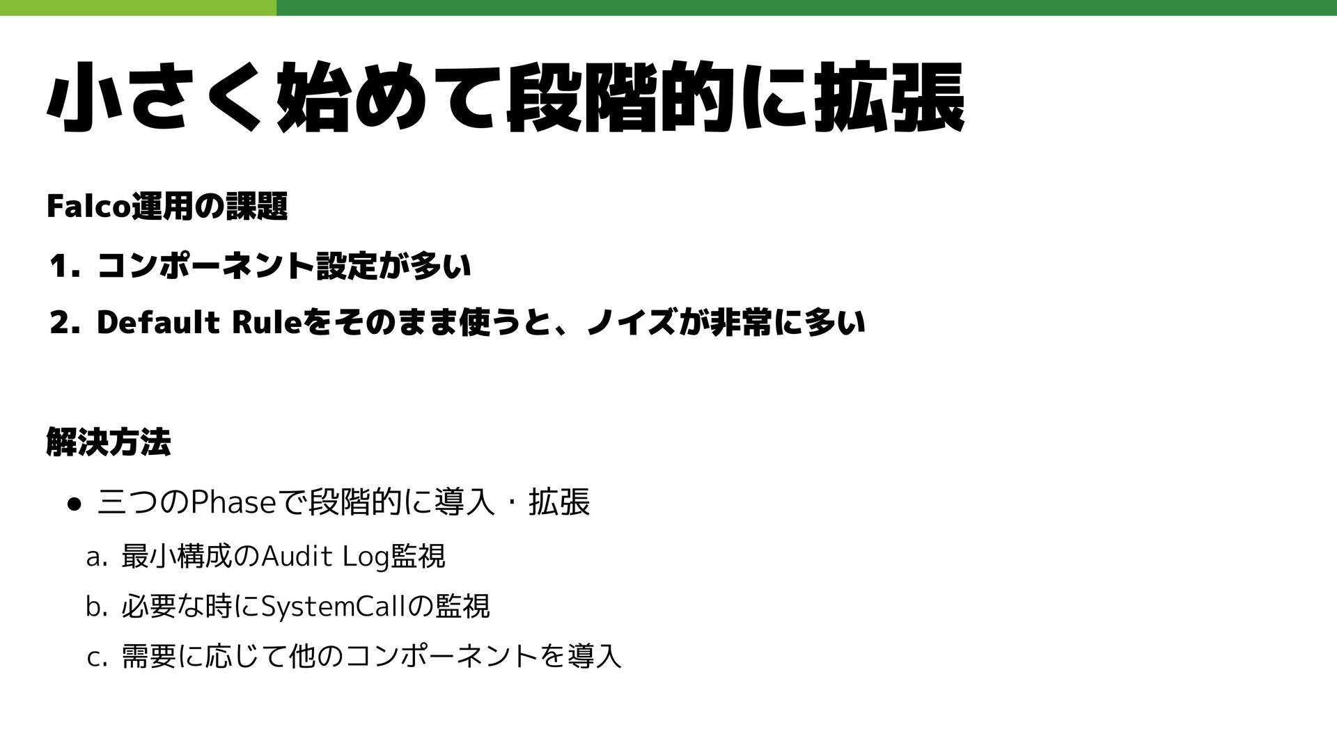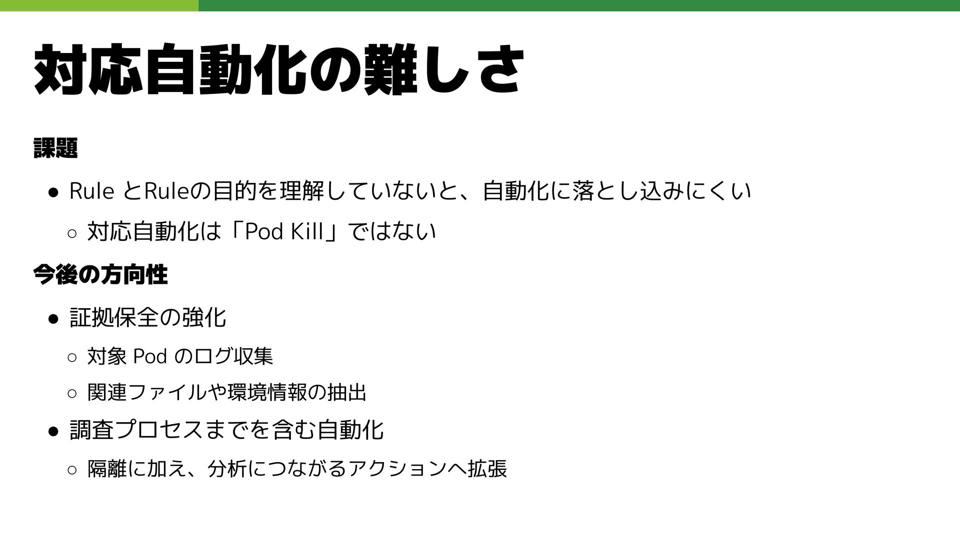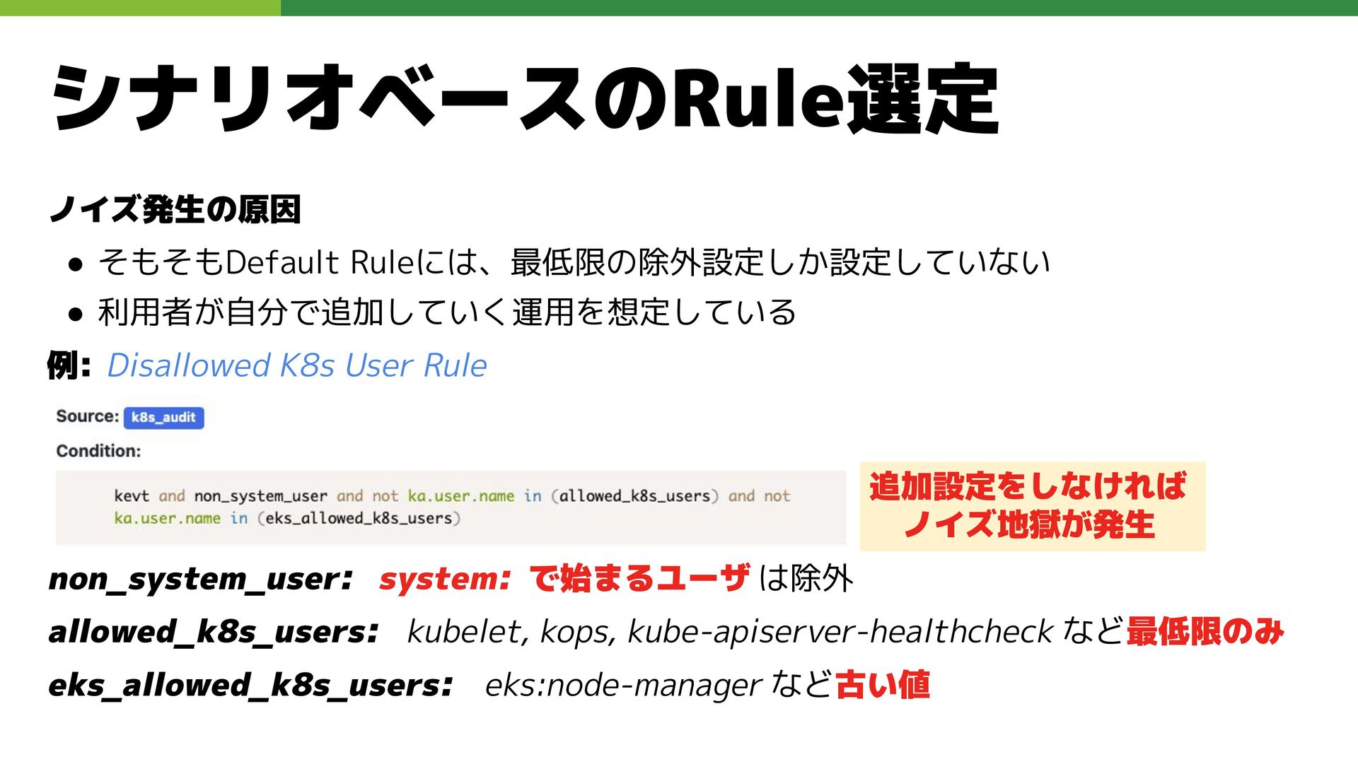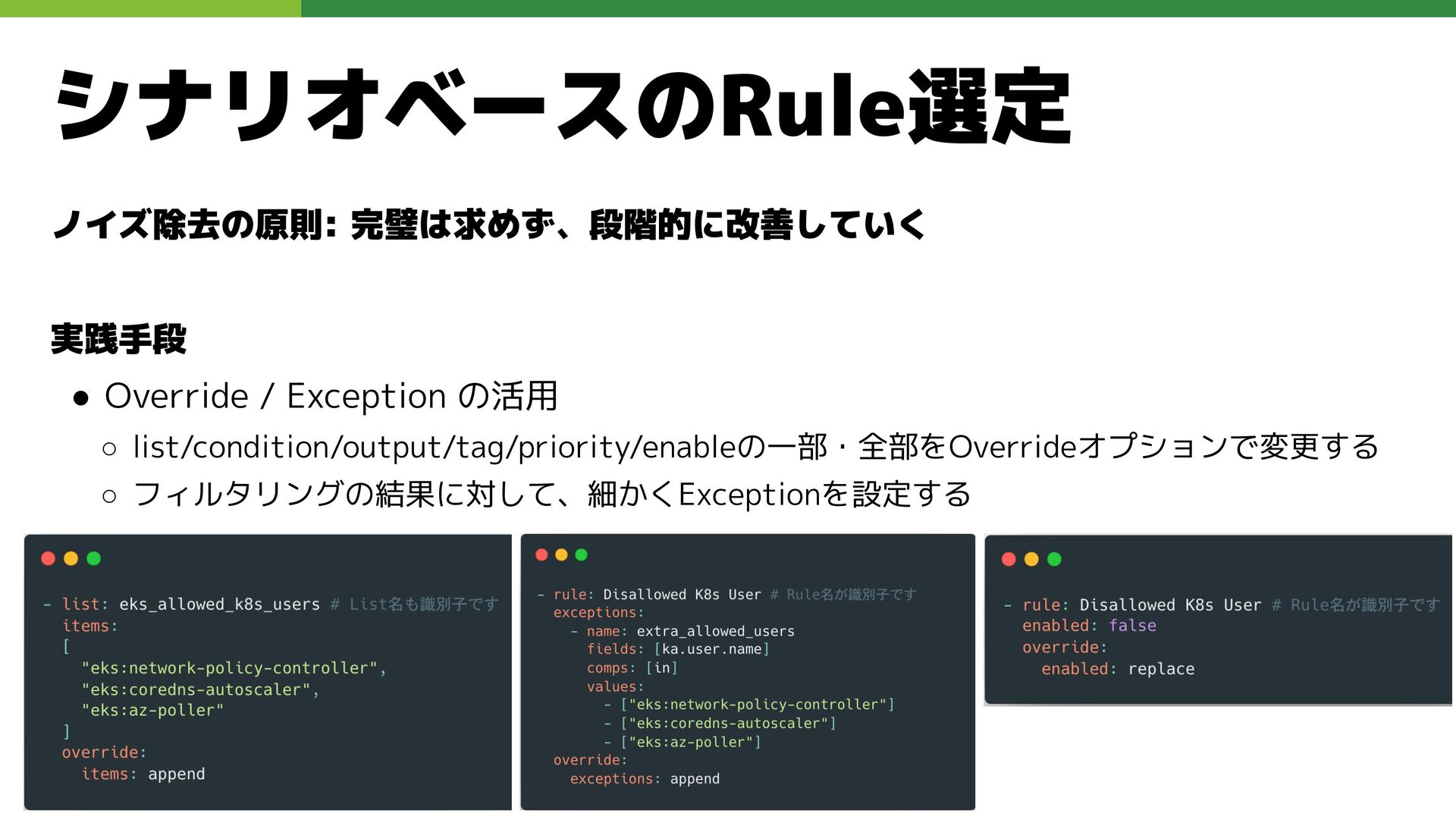 適切なRBAC・ServiceAccount *必要 ◦ 適切なNetwork Policy *必要 ◦ コンポーネントセキュリティ設定 (認証・認可・TLS) *Managedの場合、一部設定済み • Pod Security ◦ 適切なK8s Secrets扱い *必要 ◦ イメージ脆弱性対応(サプライチェーン攻撃) *必要 ◦ Security Contexts関連設定 *必要 ◦ RuntimeClass / Sandbox Podの使用 * 使用事例が少ない ◦ Linux Kernel (Seccomp, AppArmor, SELinux) * Managedの場合、制限がある コンテナランタイム セキュリティ