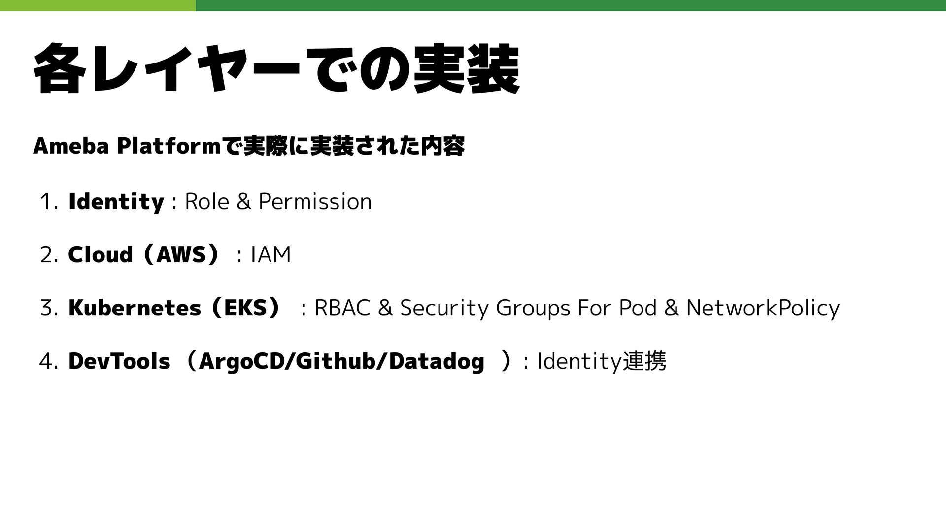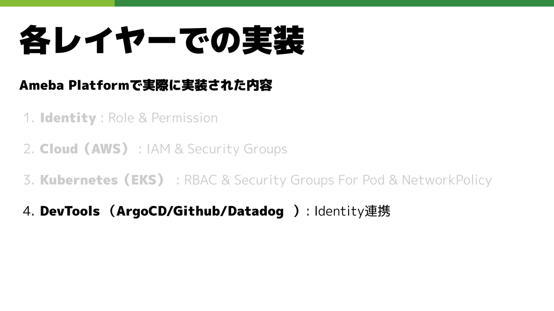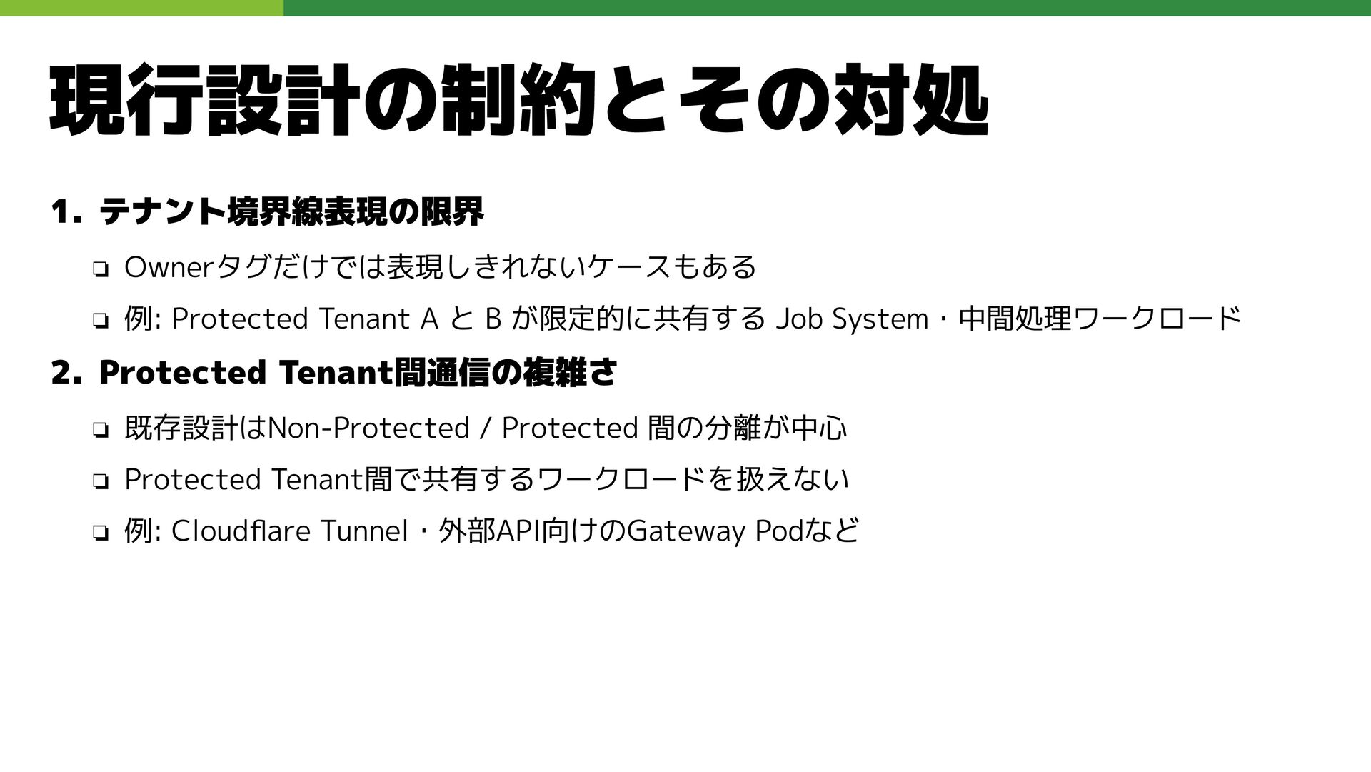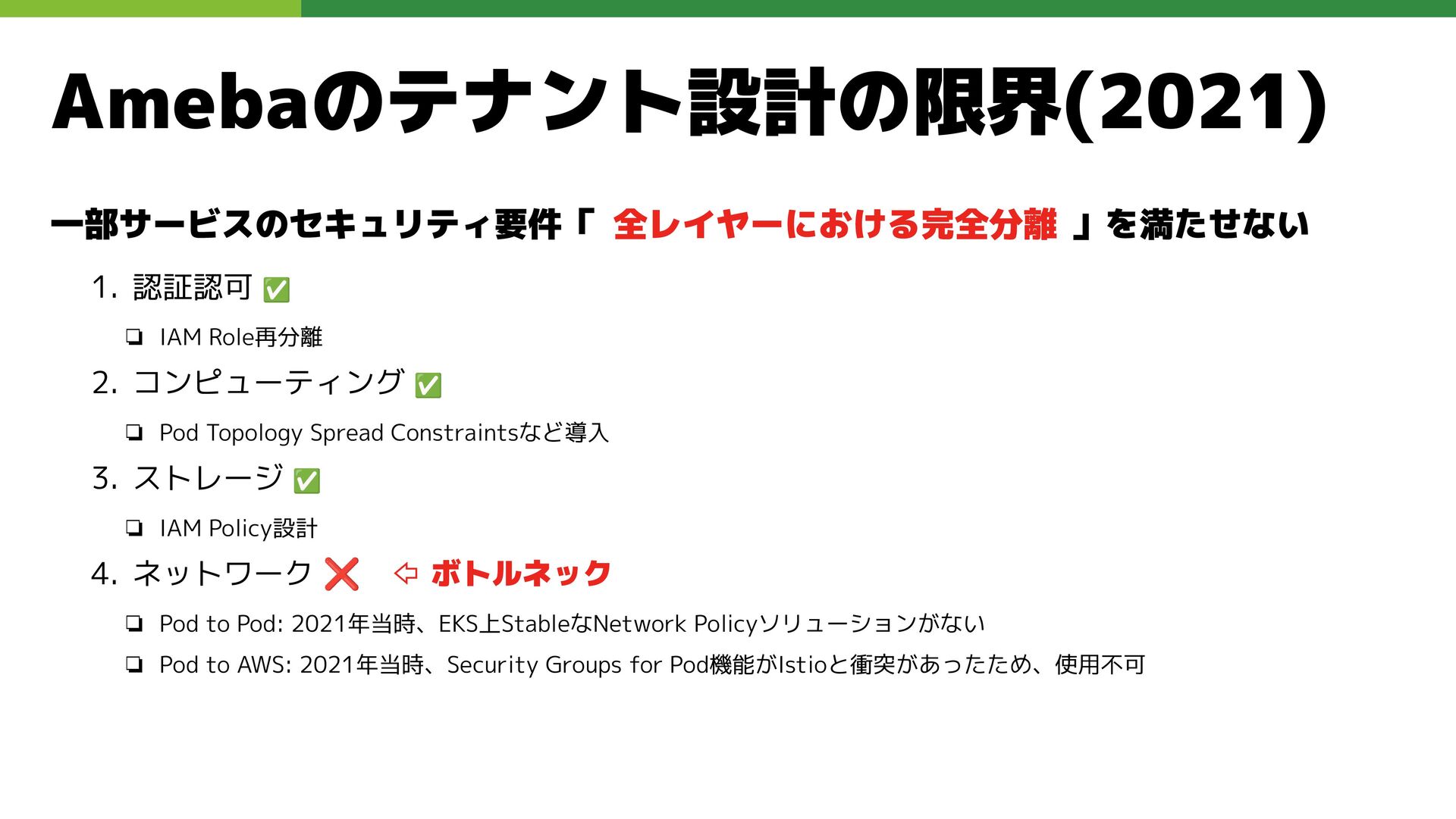 2021年当時、EKS上StableなNetwork Policyソリューションがない ◦ Pod to AWS: 2021年当時、Security Groups for Pod機能がIstioと衝突があったため、使用不可 ❏ 2023年以降いずれも改善された ✅ ◦ Pod to Pod: EKS vpccniにL4のNetwork Policy が実装 ◦ Pod to AWS: Security Groups for Pod 再検証した結果、衝突現象が解消された ❏ DB/CacheのSGでPod SGのみを許可する ◦ Network PolicyがL7まで対応できたら、Security Groups for Podが不要になる