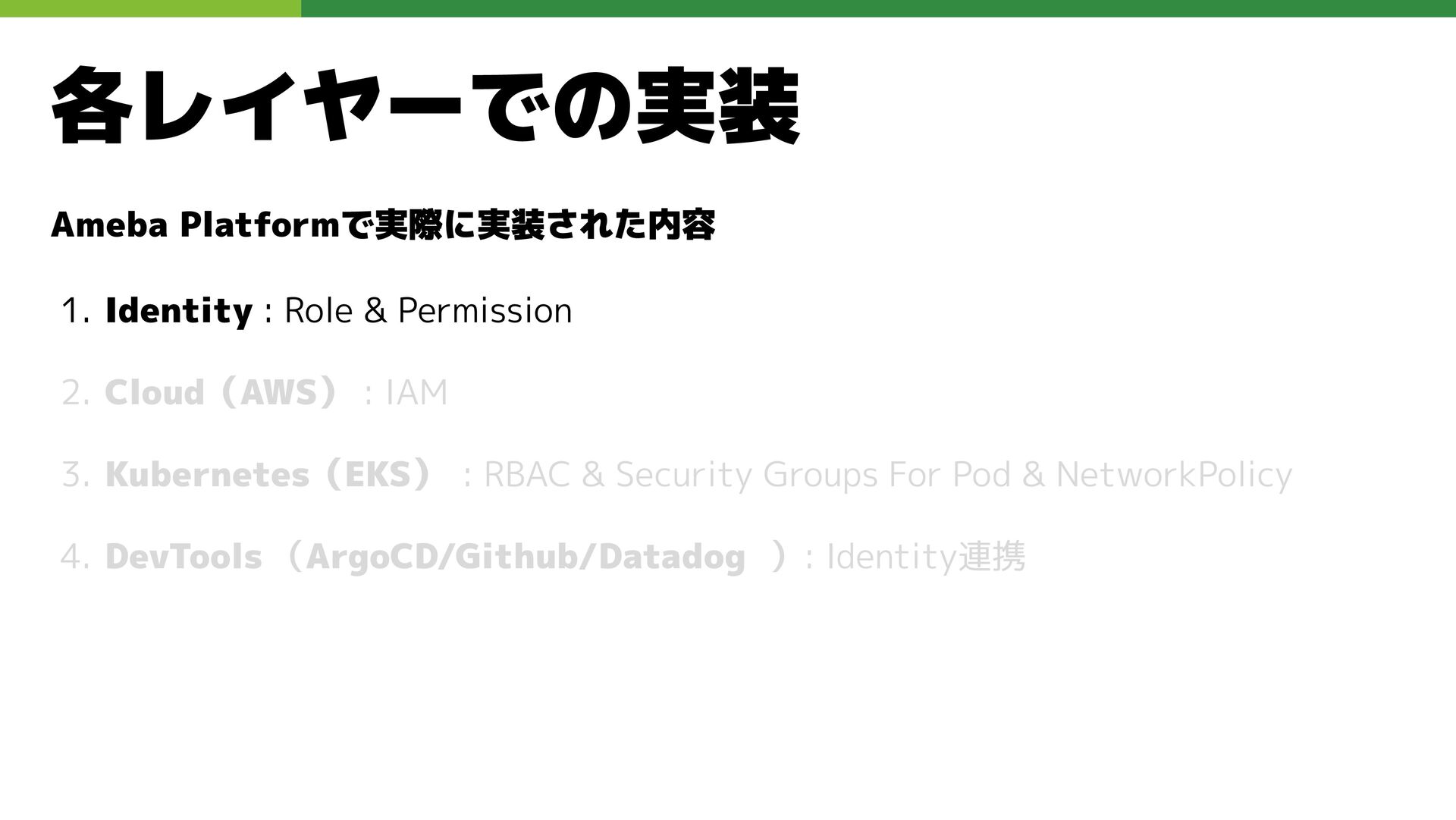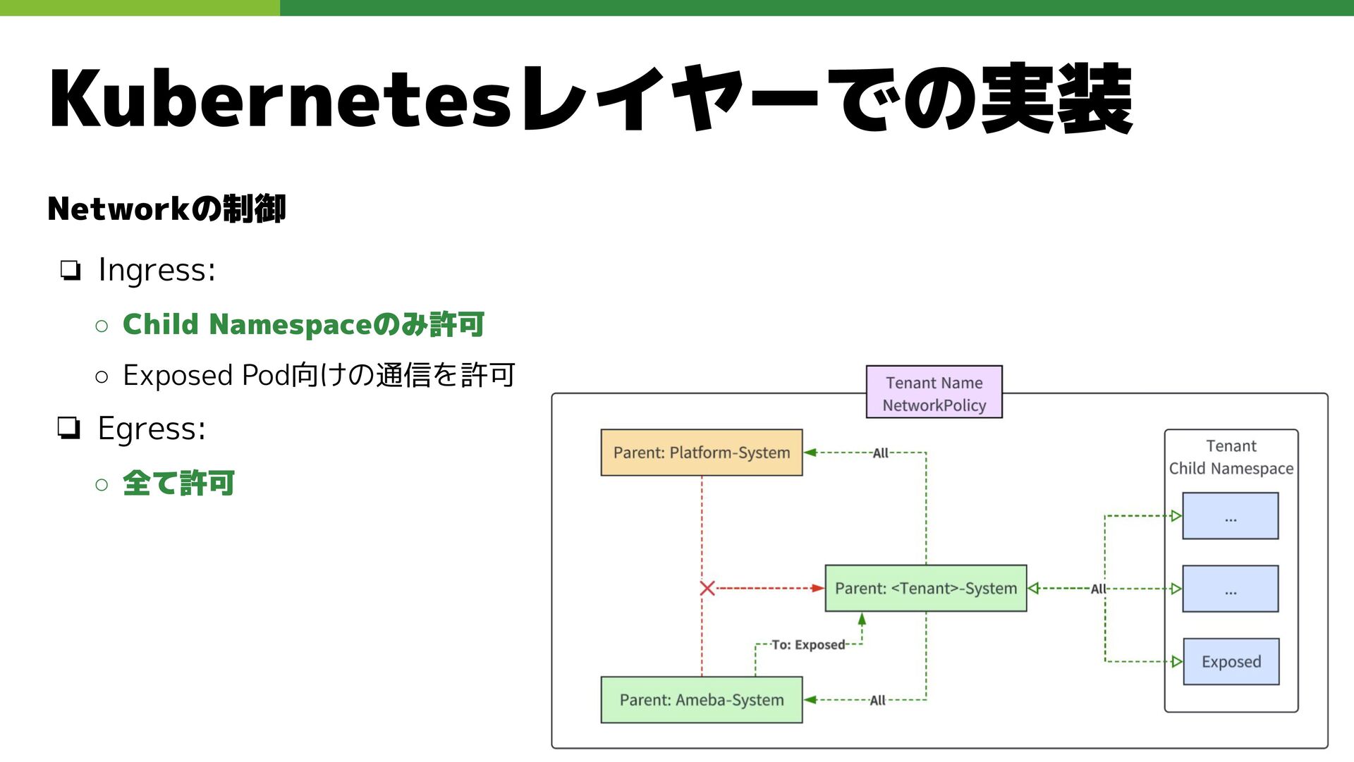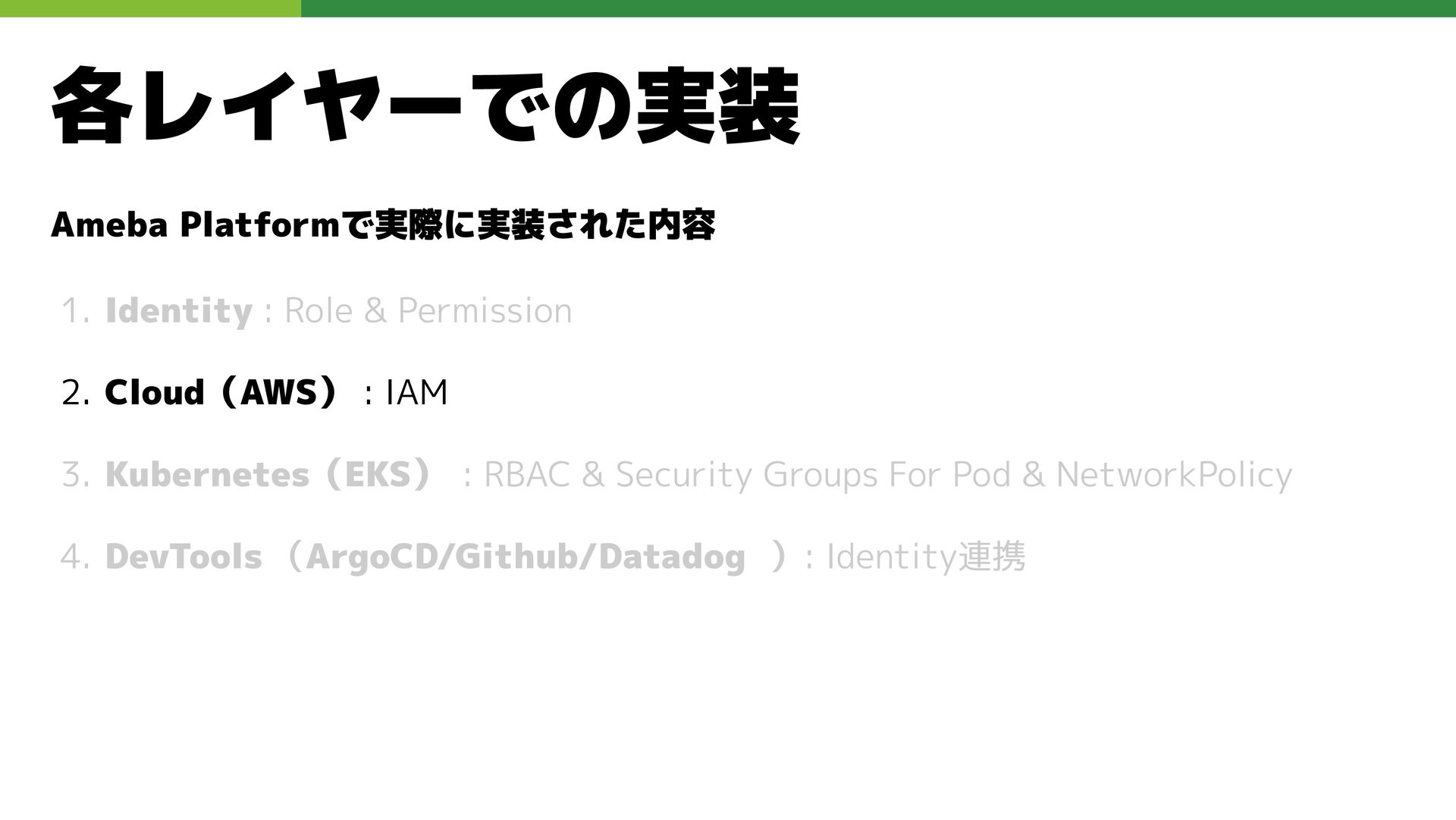 2021年当時、EKS上StableなNetwork Policyソリューションがない ◦ Pod to AWS: 2021年当時、Security Groups for Pod機能がIstioと衝突があったため、使用不可 ❏ 2023年以降いずれも改善された ✅ ◦ Pod to Pod: EKS vpccniにL4のNetwork Policy が実装 ◦ Pod to AWS: Security Groups for Pod 再検証した結果、衝突現象が解消された ❏ DB/CacheのSGでPod SGのみを許可する ◦ Network PolicyがL7まで対応できたら、Security Groups for Podが不要になる