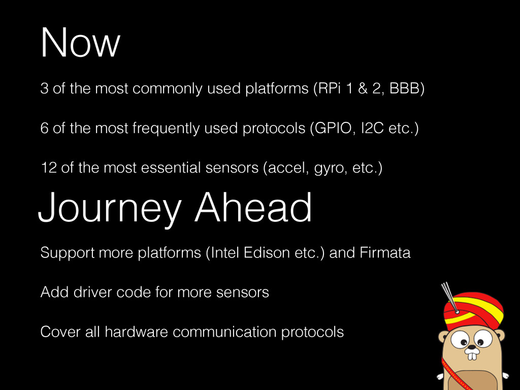 Add driver code for more sensors Cover all hardware communication protocols Now 3 of the most commonly used platforms (RPi 1 & 2, BBB) 6 of the most frequently used protocols (GPIO, I2C etc.) 12 of the most essential sensors (accel, gyro, etc.)