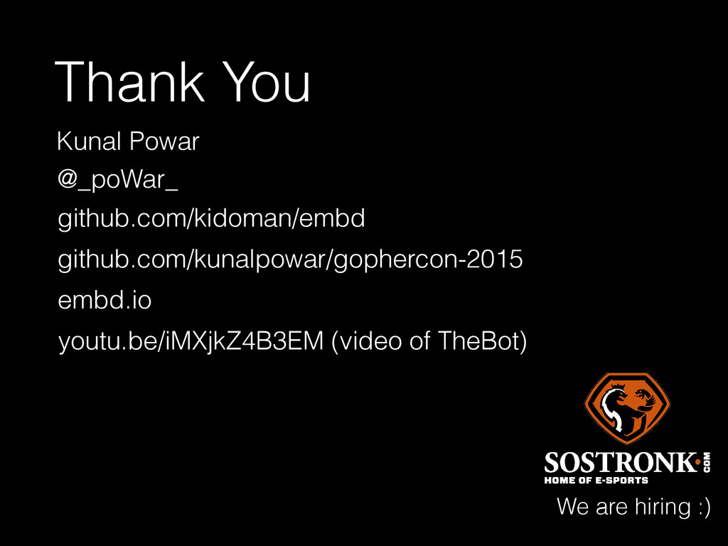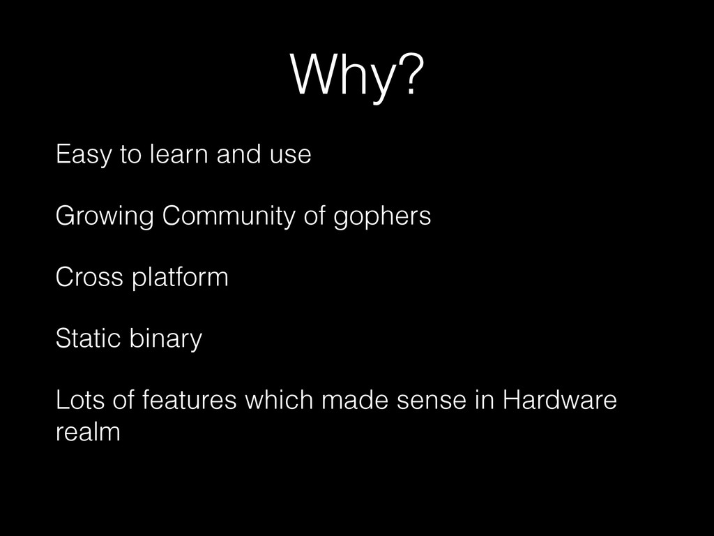 This presentation introduces EMBD (www.embd.io) as a embedded programming platform written in Go for hardware prototyping. The major focus is to justify the choice of using Go for the framework using examples.