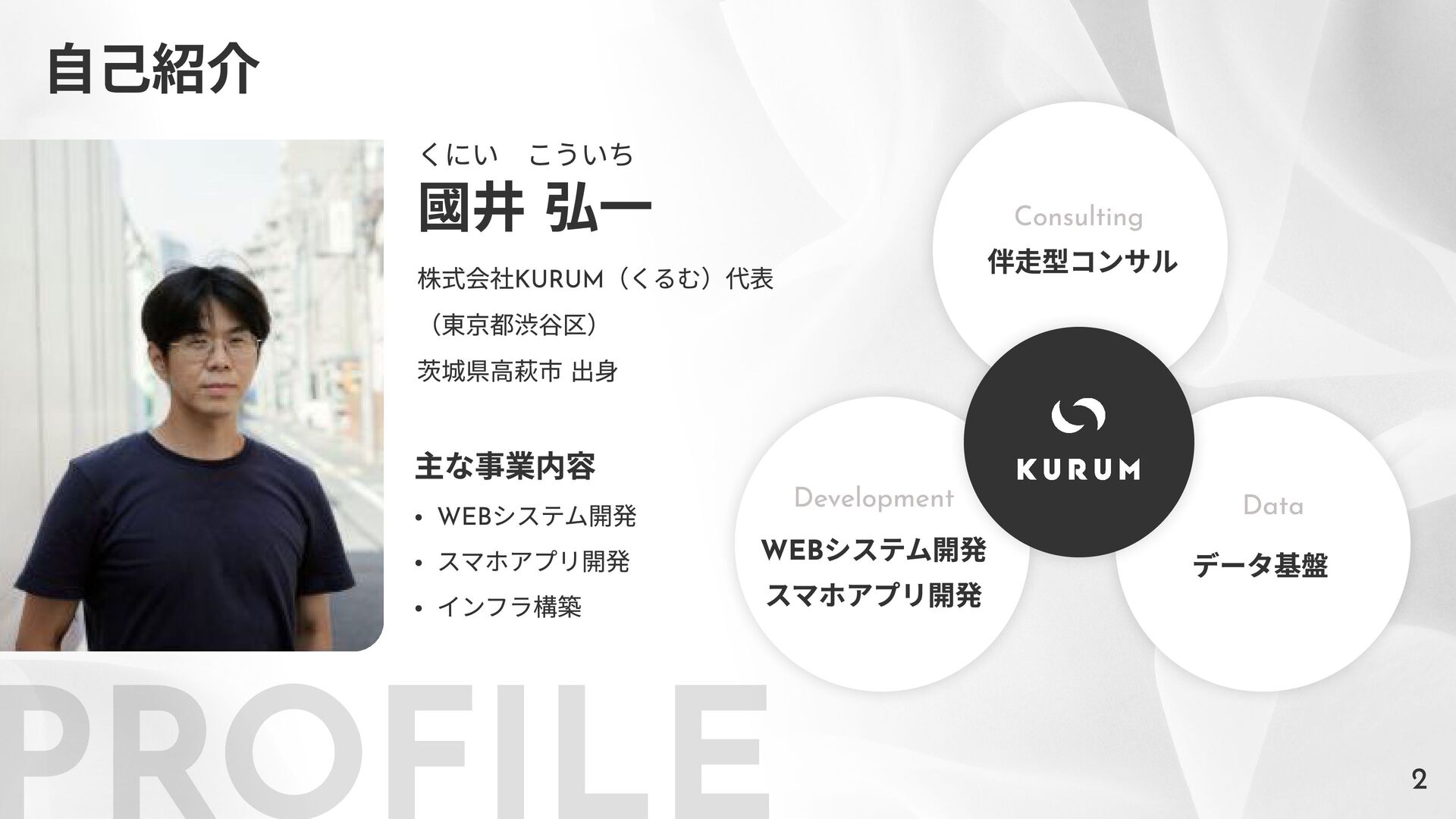 PROFILE 自己紹介 株式会社KURUM(くるむ)代表 (東京都渋谷区) 茨城県高萩市 出身 國井 弘一 くにい こういち