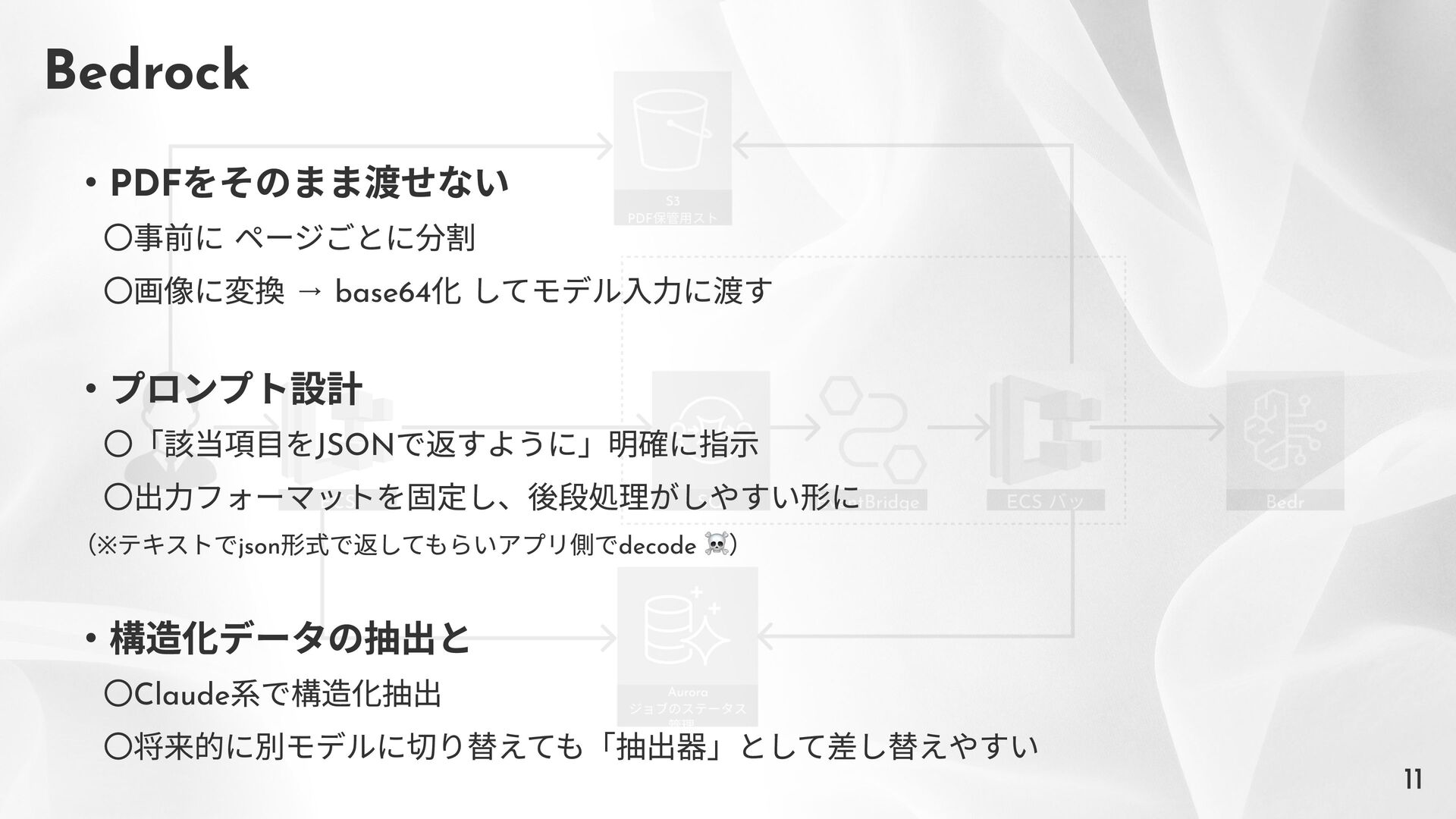 Bedrock 11 ・PDFをそのまま渡せない 〇事前に ページごとに分割 〇画像に変換 → base64化