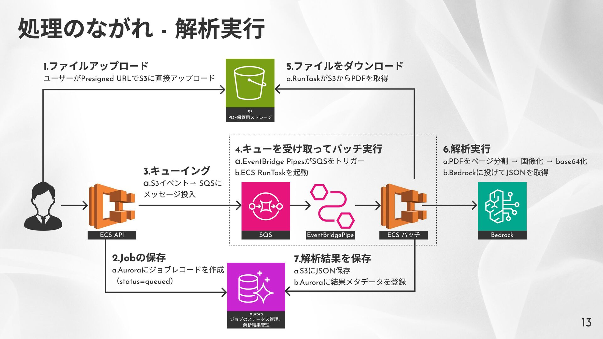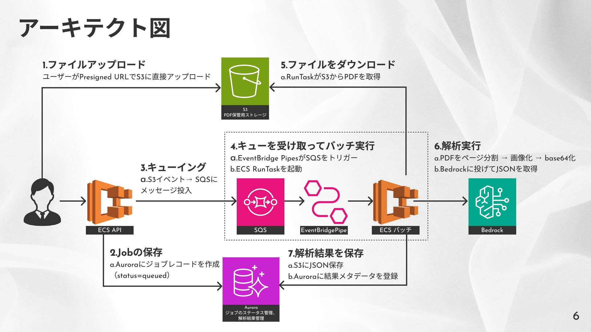 メッセージ投入 4.キューを受け取ってバッチ実行 a.EventBridge PipesがSQSをトリガー b.ECS RunTaskを起動 5.ファイルをダウンロード a.RunTaskがS3からPDFを取得 6.解析実行 a.PDFをページ分割 → 画像化 → base64化 b.Bedrockに投げてJSONを取得 7.解析結果を保存 a.S3にJSON保存 b.Auroraに結果メタデータを登録 ECS API Aurora ジョブのステータス管理、 解析結果管理 ECS バッチ Bedrock S3 PDF保管用ストレージ SQS EventBridgePipe 6