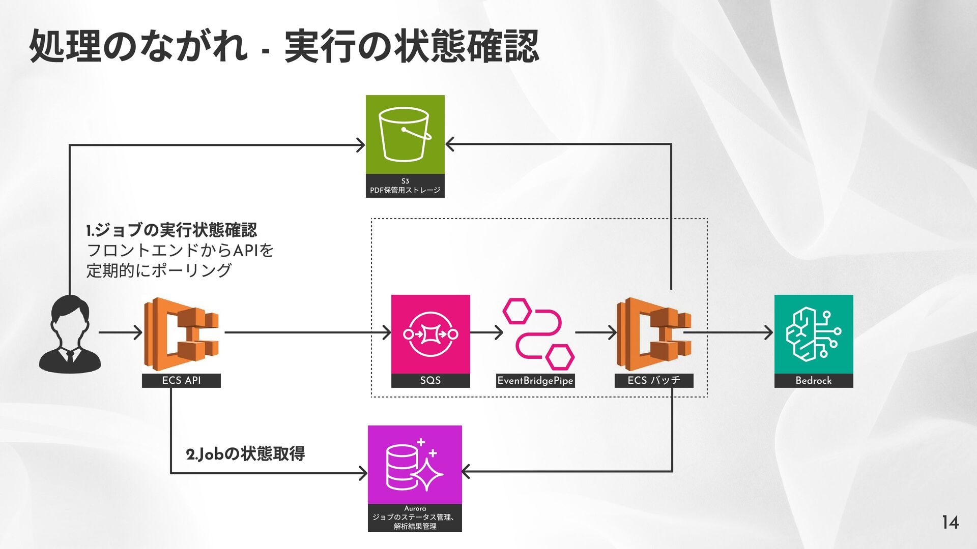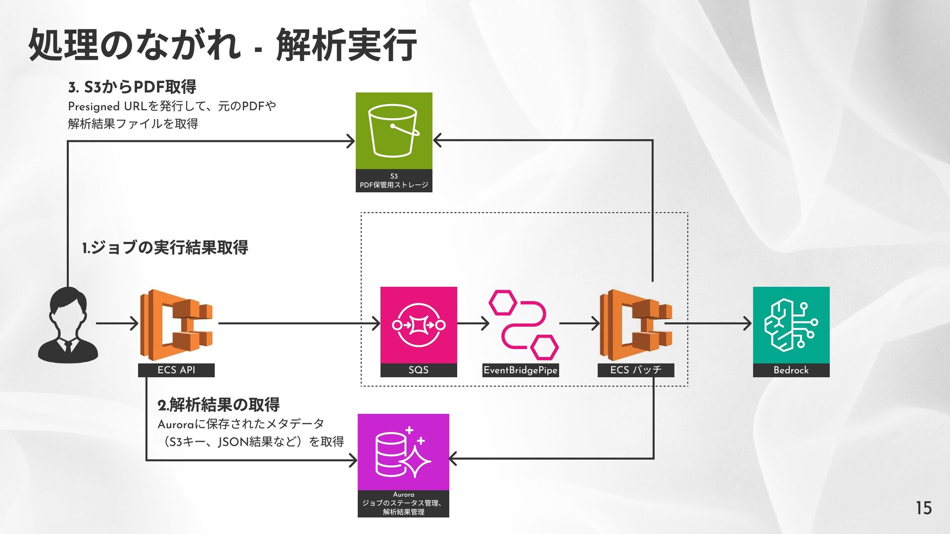 ジョブのステータス管理、 解析結果管理 ECS バッチ Bedrock S3 PDF保管用ストレージ SQS EventBridgePipe 14
