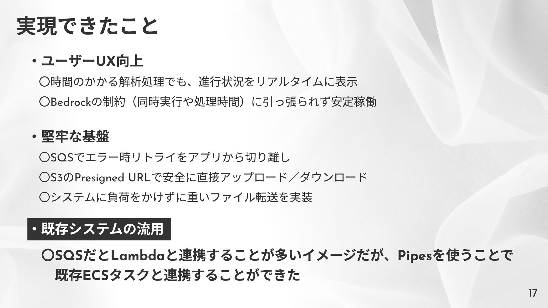 実現できたこと ・ユーザーUX向上 〇時間のかかる解析処理でも、進行状況をリアルタイムに表示 〇Bedrockの制約(同時実行や処理時間)に引っ張られず安定稼働 ・堅牢な基盤 〇SQSでエラー時リトライをアプリから切り離し