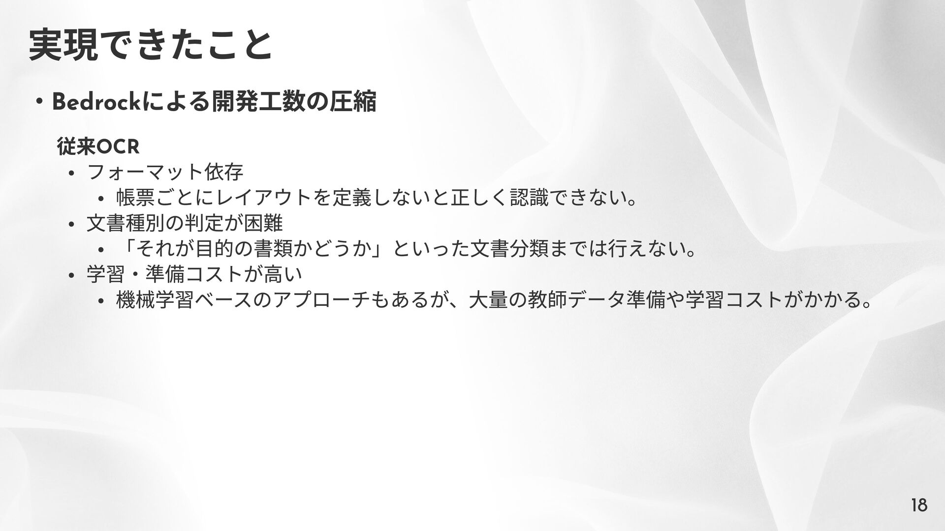 実現できたこと 従来OCR フォーマット依存 帳票ごとにレイアウトを定義しないと正しく認識できない。 文書種別の判定が困難 「それが目的の書類かどうか」といった文書分類までは行えない。 学習・準備コストが高い 機械学習ベースのアプローチもあるが、大量の教師データ準備や学習コストがかかる。 18 ・Bedrockによる開発工数の圧縮