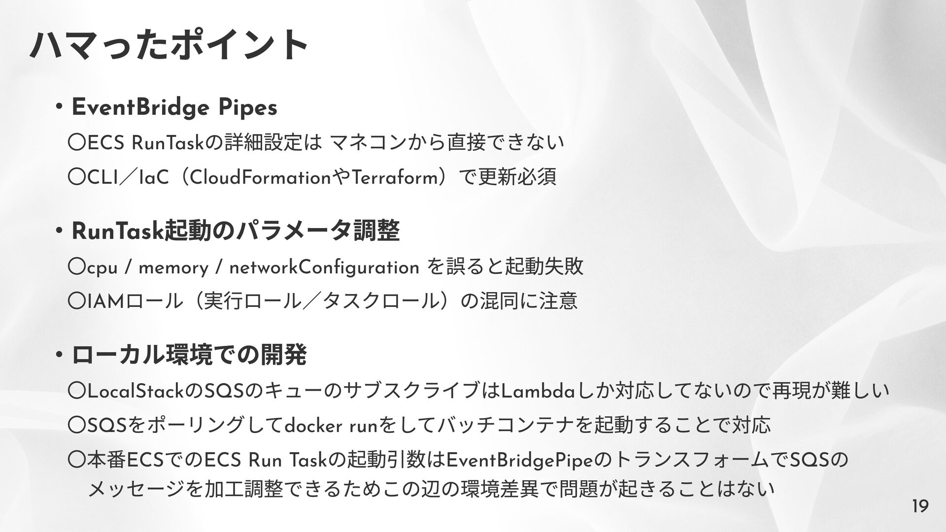 〇cpu / memory / networkConfiguration を誤ると起動失敗 〇IAMロール(実行ロール/タスクロール)の混同に注意 ・ローカル環境での開発 〇LocalStackのSQSのキューのサブスクライブはLambdaしか対応してないので再現が難しい 〇SQSをポーリングしてdocker runをしてバッチコンテナを起動することで対応 〇本番ECSでのECS Run Taskの起動引数はEventBridgePipeのトランスフォームでSQSの メッセージを加工調整できるためこの辺の環境差異で問題が起きることはない 19