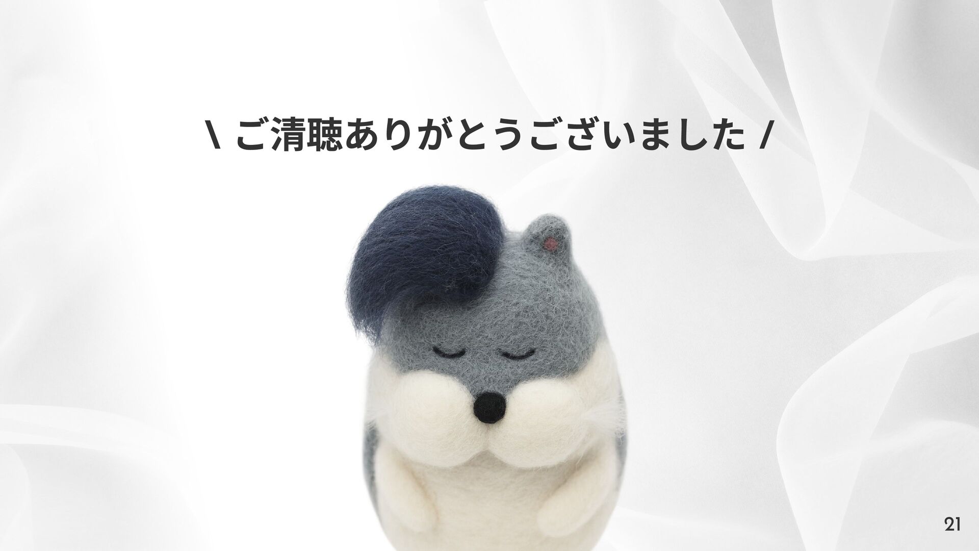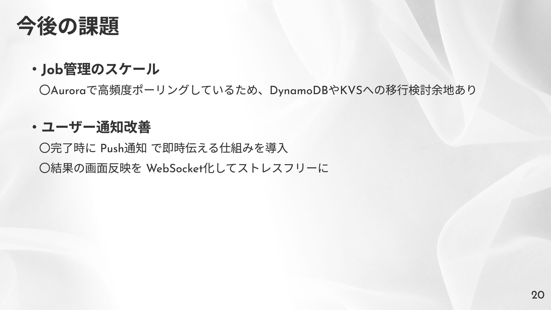 今後の課題 20 ・Job管理のスケール 〇Auroraで高頻度ポーリングしているため、DynamoDBやKVSへの移行検討余地あり ・ユーザー通知改善 〇完了時に Push通知 で即時伝える仕組みを導入