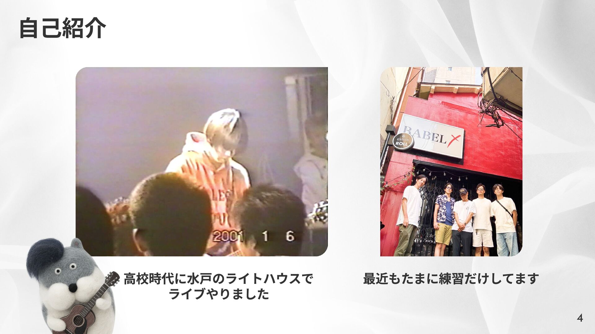 自己紹介 4 高校時代に水戸のライトハウスで ライブやりました 最近もたまに練習だけしてます