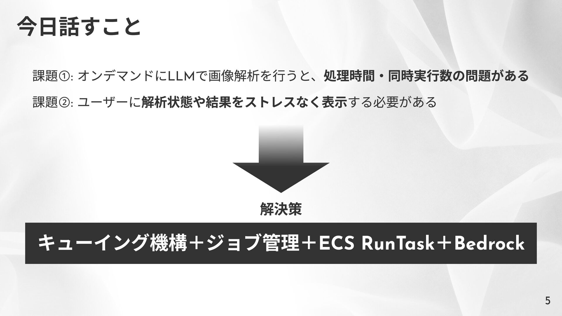 今日話すこと 5 課題①: オンデマンドにLLMで画像解析を行うと、処理時間・同時実行数の問題がある 課題②: ユーザーに解析状態や結果をストレスなく表示する必要がある キューイング機構+ジョブ管理+ECS RunTask+Bedrock 解決策