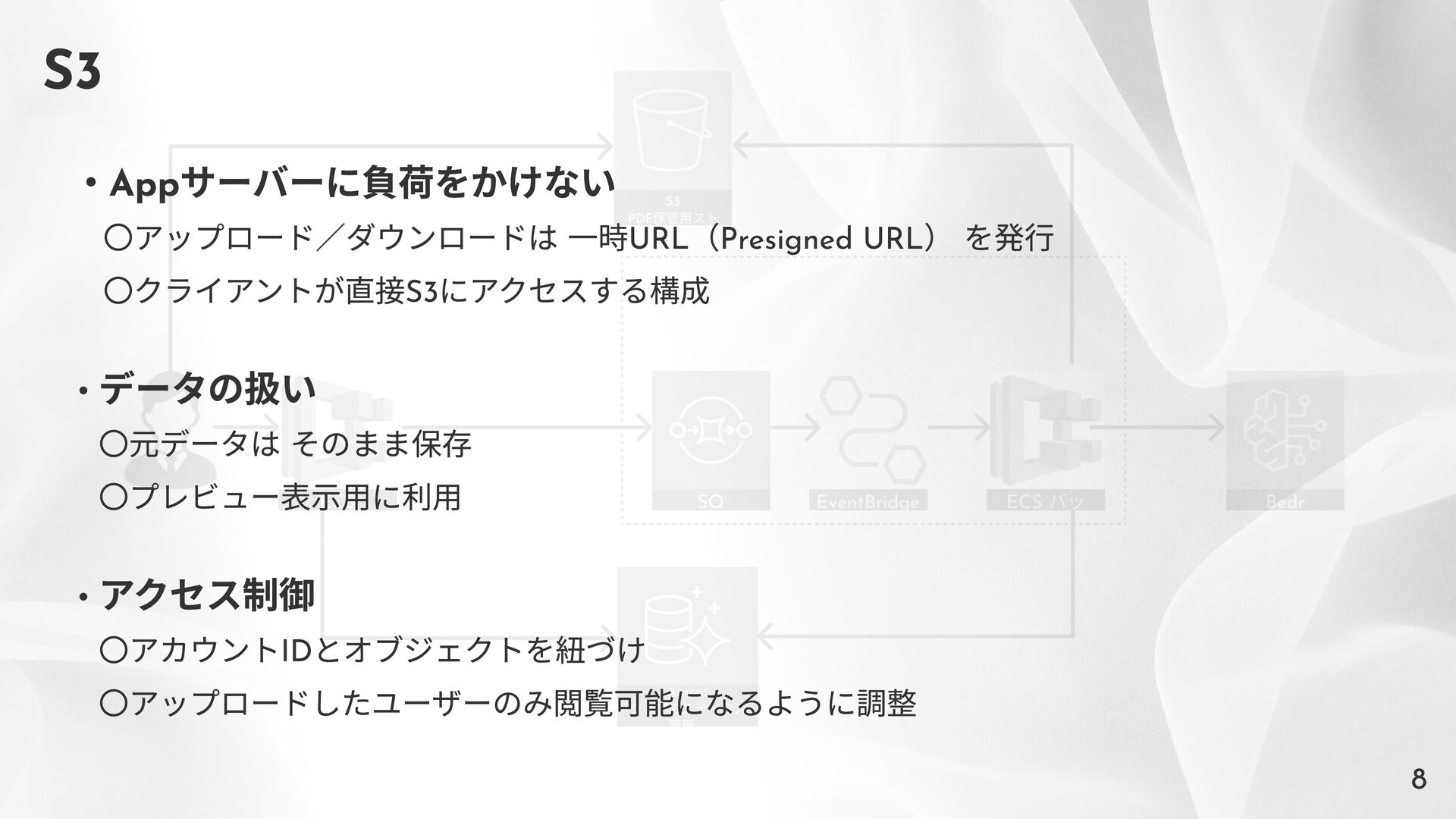 S3 ・Appサーバーに負荷をかけない 〇アップロード/ダウンロードは 一時URL(Presigned URL) を発行 〇クライアントが直接S3にアクセスする構成 ・データの扱い