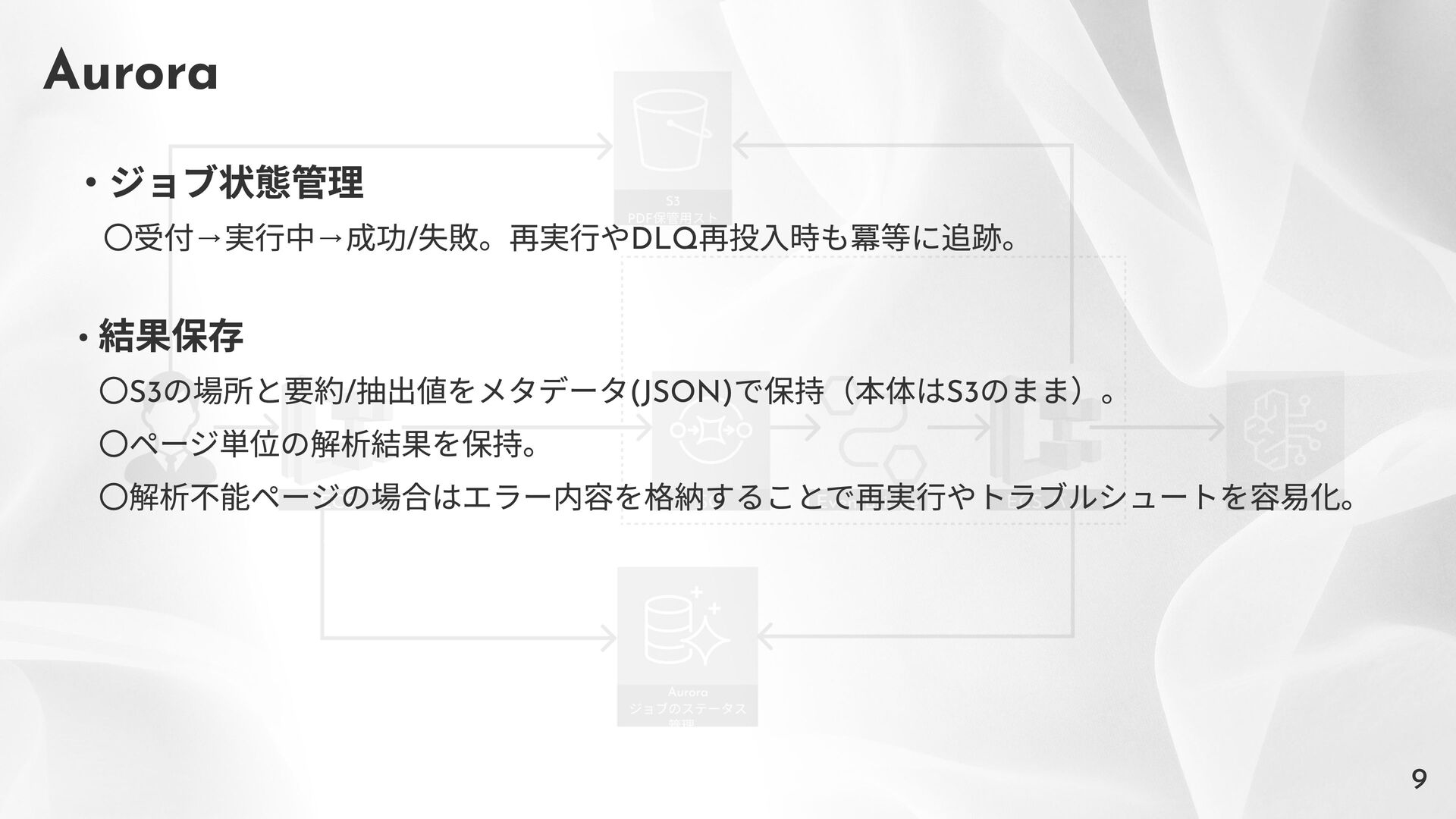 Aurora 9 ・ジョブ状態管理 〇受付→実行中→成功/失敗。再実行やDLQ再投入時も冪等に追跡。 ・結果保存 〇S3の場所と要約/抽出値をメタデータ(JSON)で保持(本体はS3のまま)。 〇ページ単位の解析結果を保持。