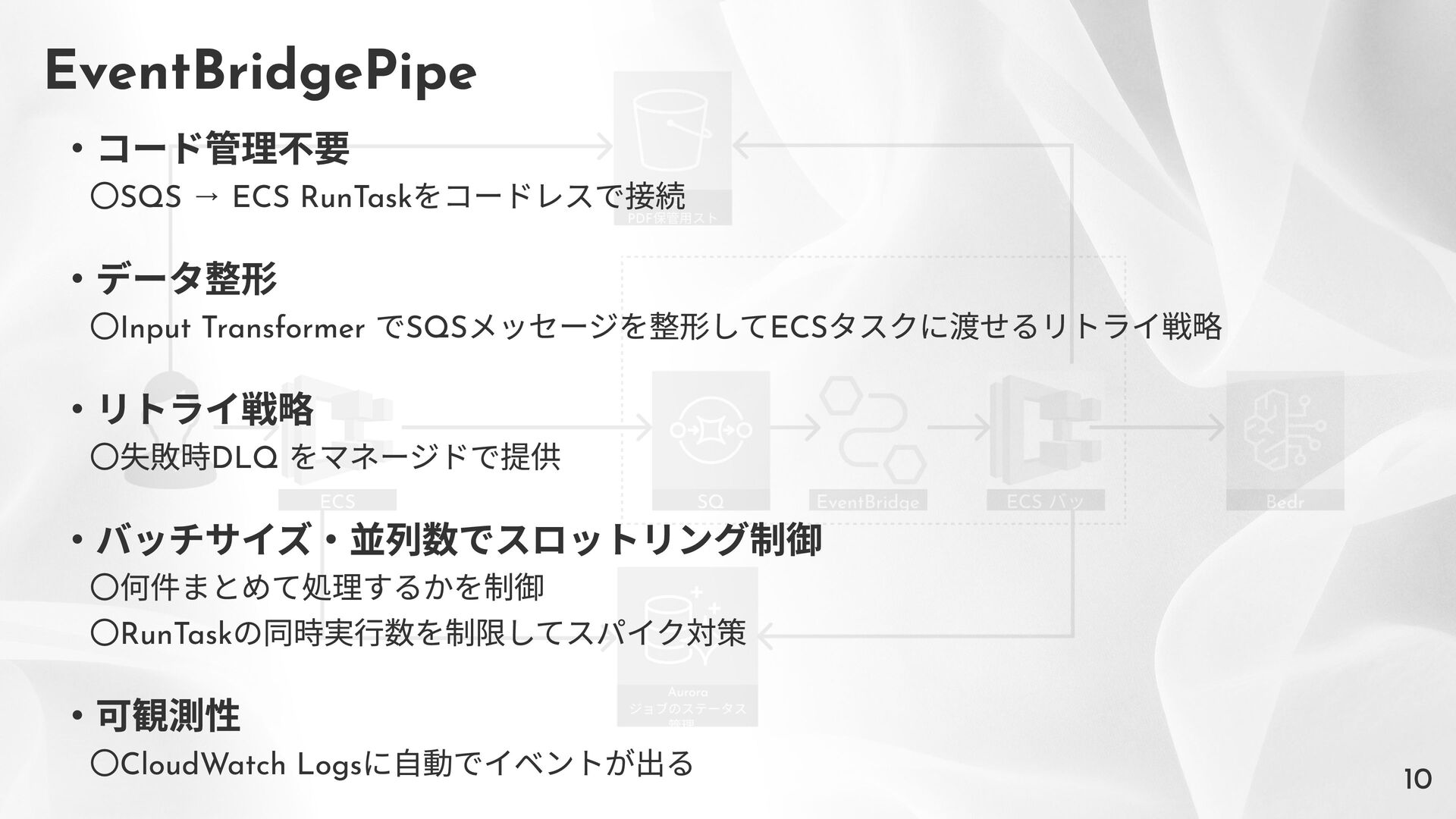 EventBridgePipe 10 ・コード管理不要 〇SQS → ECS RunTaskをコードレスで接続 ・データ整形