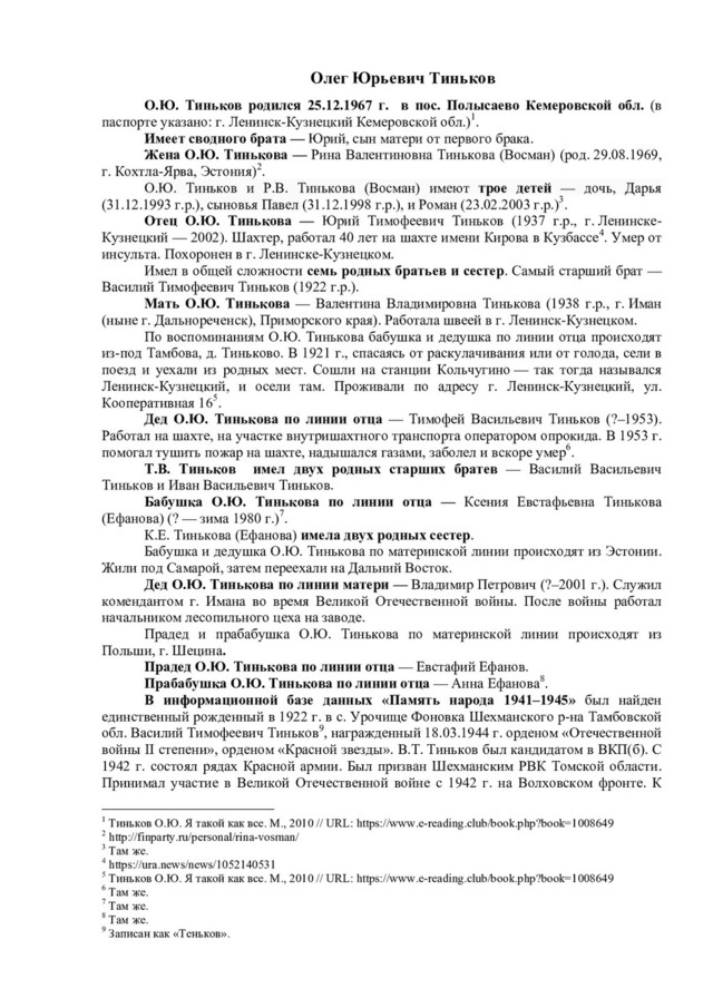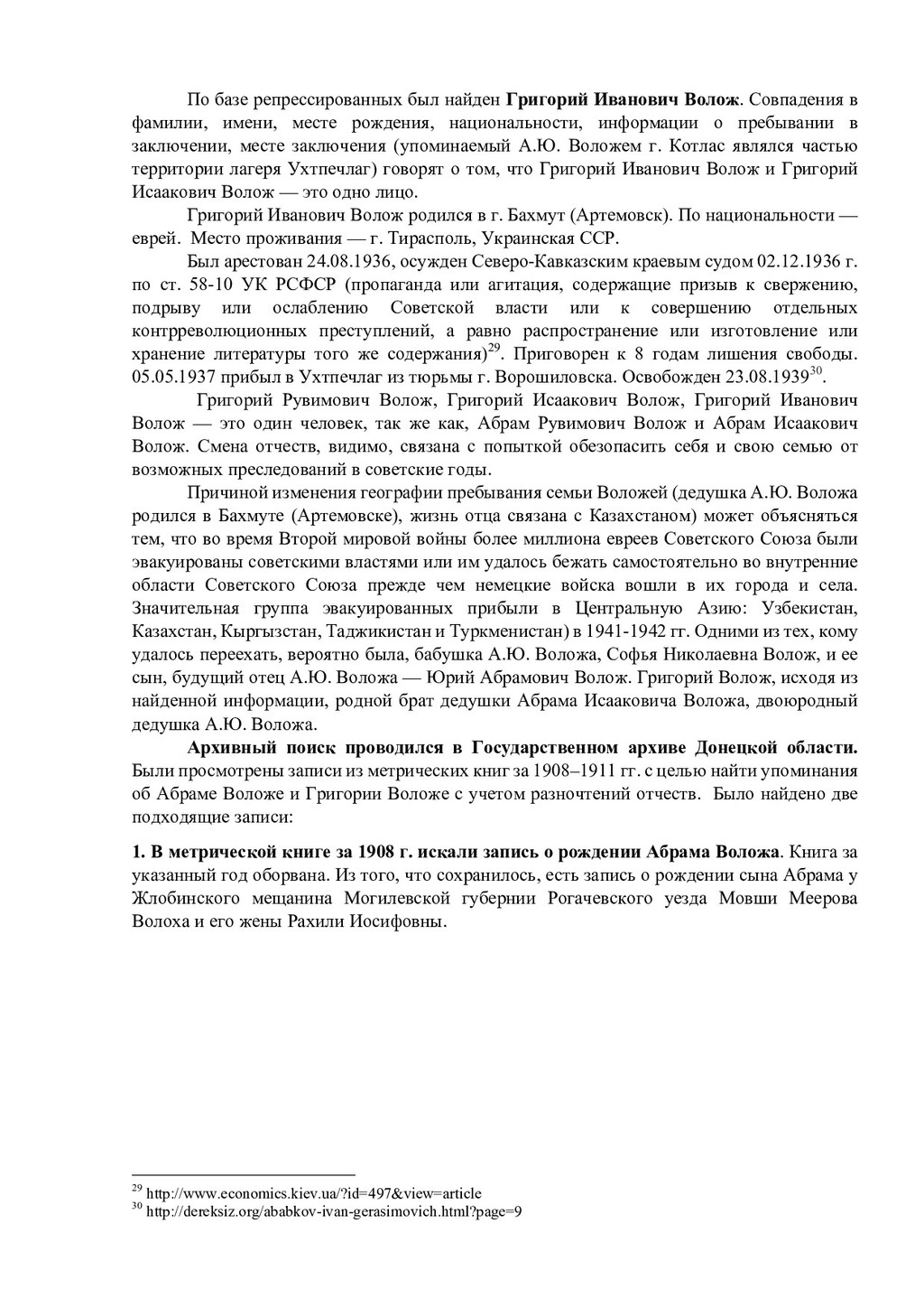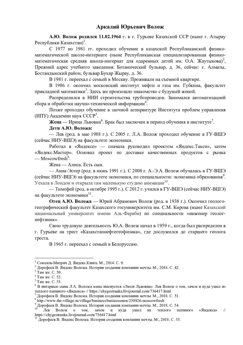 Усминский. В.Л. Усминский работал в качестве профессора в Уральской государственной консерватории, был скрипачом, дирижером21. В книге «Яндекс Воложа. История создания компании мечты» упоминается дед по линии отца А.Ю. Воложа — Абрам Рувимович Волож22. В книгах про биографию и карьерный путь А.Ю. Воложа среди прочих родственников упоминается Григорий Рувимович Волож. Предполагается, что он либо брат деда А.Ю. Воложа, или просто дальний родственник. Известно, что Г.Р. Волож переехал в какой-то момент с семьей из Харькова в Москву, был активным троцкистом. В 1934 г. был осужден за «контрреволюционную деятельность». Находился в списках заключенных, которые работали в районе г. Котлас на объектах ГУЛЖДС НКВД СССР23. В 1940 г. освободился. И далее без дат о нем известно, что работал вольнонаемным при строительстве Печорской железной дороги, на стройке «Норильский никель», стал почетным жителем г. Норильска. Позже переехал в Москву, был членом клуба эксилибристов, жил в «полуторакомнатной квартирке» у метро «Молодежная»24. Жена Г.Р. Воложа — Марьяна Самойловна Цин. Известная японистка, одна из авторов большого японско-русского словаря25. На портале «Память народа 1941–1945» был найден Абрам Исаакович Волож (род. в 1908 г., Российская империя, Екатеринославская губерния, г. Бахмут (с 1924 по 2016 гг. город носил название Артемовск) — июнь 1942 г.). Еврей, имел высшее образование, был членом ВКП(б). Призван в армию Кармакчинским РВК в 1941 г26. Политрук, воевал в составе 109 стрелковой дивизии, был лейтенантом-редактором Красноармейской газеты 109 артиллерийской дивизии. Пропал без вести. Его жена — Софья Николаевна Волож. Проживала в пос. Джалагаш (село, ранее поселок городского типа в составе Кызылординской области Казахстана)27. На «Памяти народа 1941–1945» был найден также Григорий Исаакович Волож (1911 г.р., Российская империя, Екатеринославская губерния, г. Бахмут (Артемовск) — 14.06.1998). По национальности еврей. Место призыва — Березовский РВК, Украинская ССР, Одесская обл., Березовский р-н. В рядах Красной армии состоял с 1942 г. Воинское звание — старший сержант. Беспартийный. Участвовал в битве за Кавказ, сражался с 20.11.1942 по 31.12.1942 гг. под Малгобеком, с 28.01.1943 по 03.02.1943 гг. под Крымской, с 27.02.1943 по 21.03.1943 гг. под Новороссийском, будучи старшиной роты отдельного пулемётного батальона 337-й стрелковой дивизии. Занимался обеспечением роты боеприпасами и питанием. В тяжелые моменты, когда кухня не могла подойти близко к расположению роты лично организовал доставку горячей пищи под огнем противника. Позднее стал офицером. После окончания войны в звании лейтенанта был уволен в запас. Награжден медалью «За боевые заслуги», приказ подразделения № 8/н от 20.05.1943 г. Издан 337 сд., награжден Орденом отечественной войны I степени. Проживал в Смоленске. Похоронен на Братском кладбище Смоленска28. !!!!!!!!!!!!!!!!!!!!!!!!!!!!!!!!!!!!!!!!!!!!!!!!!!!!!!!!!!!!! 21 Соколов-Митрич Д. Яндекс.Книга. М., 2014. С. 9. 22 Дорофеев В. Яндекс Воложа. История создания компании мечты. М., 2018. С. 45. 23 Там же. С. 45. 24 Соколов-Митрич Д. Яндекс.Книга. М., 2014. С. 25. 25!Там же. С. 25.! 26 http://zhenis.orda.gov.kz/spisok/index?page=841 27 Проект «Память народа. 1941–1945 гг.» [Электронный ресурс].! 28 http://war-smolnecropol.ru/index.php/g1/br1/757-volozh-grigoriy-isakovich