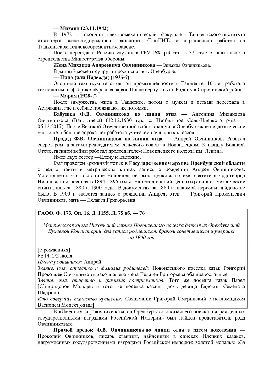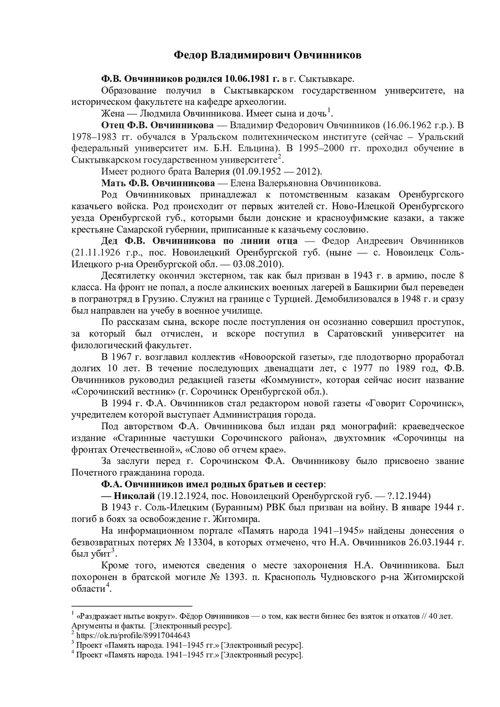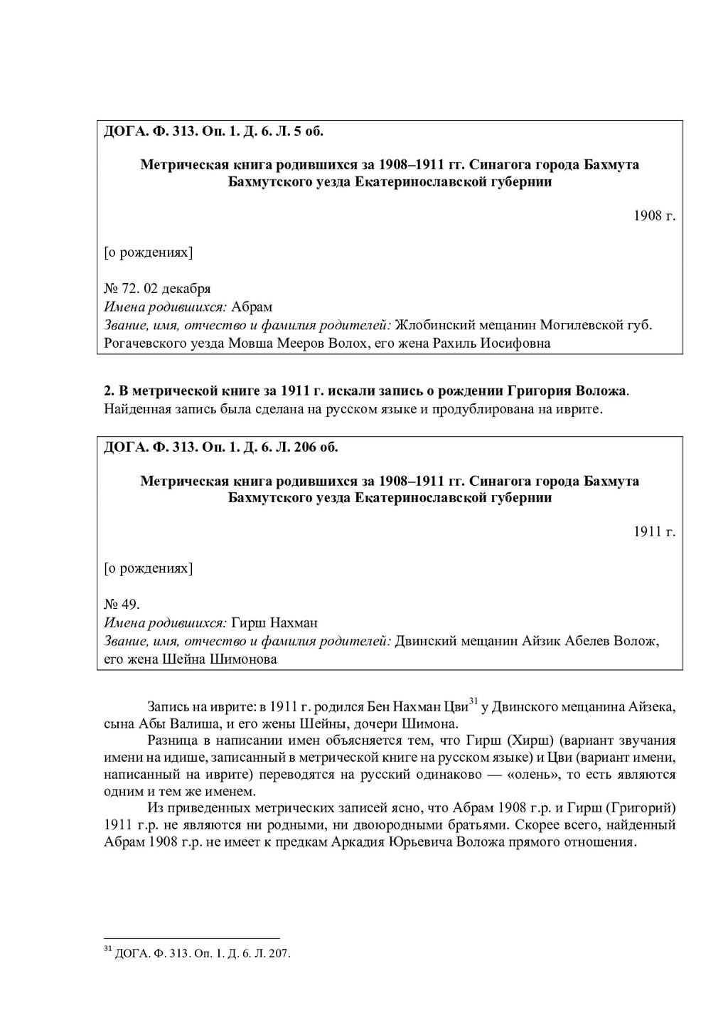 Усминский. В.Л. Усминский работал в качестве профессора в Уральской государственной консерватории, был скрипачом, дирижером21. В книге «Яндекс Воложа. История создания компании мечты» упоминается дед по линии отца А.Ю. Воложа — Абрам Рувимович Волож22. В книгах про биографию и карьерный путь А.Ю. Воложа среди прочих родственников упоминается Григорий Рувимович Волож. Предполагается, что он либо брат деда А.Ю. Воложа, или просто дальний родственник. Известно, что Г.Р. Волож переехал в какой-то момент с семьей из Харькова в Москву, был активным троцкистом. В 1934 г. был осужден за «контрреволюционную деятельность». Находился в списках заключенных, которые работали в районе г. Котлас на объектах ГУЛЖДС НКВД СССР23. В 1940 г. освободился. И далее без дат о нем известно, что работал вольнонаемным при строительстве Печорской железной дороги, на стройке «Норильский никель», стал почетным жителем г. Норильска. Позже переехал в Москву, был членом клуба эксилибристов, жил в «полуторакомнатной квартирке» у метро «Молодежная»24. Жена Г.Р. Воложа — Марьяна Самойловна Цин. Известная японистка, одна из авторов большого японско-русского словаря25. На портале «Память народа 1941–1945» был найден Абрам Исаакович Волож (род. в 1908 г., Российская империя, Екатеринославская губерния, г. Бахмут (с 1924 по 2016 гг. город носил название Артемовск) — июнь 1942 г.). Еврей, имел высшее образование, был членом ВКП(б). Призван в армию Кармакчинским РВК в 1941 г26. Политрук, воевал в составе 109 стрелковой дивизии, был лейтенантом-редактором Красноармейской газеты 109 артиллерийской дивизии. Пропал без вести. Его жена — Софья Николаевна Волож. Проживала в пос. Джалагаш (село, ранее поселок городского типа в составе Кызылординской области Казахстана)27. На «Памяти народа 1941–1945» был найден также Григорий Исаакович Волож (1911 г.р., Российская империя, Екатеринославская губерния, г. Бахмут (Артемовск) — 14.06.1998). По национальности еврей. Место призыва — Березовский РВК, Украинская ССР, Одесская обл., Березовский р-н. В рядах Красной армии состоял с 1942 г. Воинское звание — старший сержант. Беспартийный. Участвовал в битве за Кавказ, сражался с 20.11.1942 по 31.12.1942 гг. под Малгобеком, с 28.01.1943 по 03.02.1943 гг. под Крымской, с 27.02.1943 по 21.03.1943 гг. под Новороссийском, будучи старшиной роты отдельного пулемётного батальона 337-й стрелковой дивизии. Занимался обеспечением роты боеприпасами и питанием. В тяжелые моменты, когда кухня не могла подойти близко к расположению роты лично организовал доставку горячей пищи под огнем противника. Позднее стал офицером. После окончания войны в звании лейтенанта был уволен в запас. Награжден медалью «За боевые заслуги», приказ подразделения № 8/н от 20.05.1943 г. Издан 337 сд., награжден Орденом отечественной войны I степени. Проживал в Смоленске. Похоронен на Братском кладбище Смоленска28. !!!!!!!!!!!!!!!!!!!!!!!!!!!!!!!!!!!!!!!!!!!!!!!!!!!!!!!!!!!!! 21 Соколов-Митрич Д. Яндекс.Книга. М., 2014. С. 9. 22 Дорофеев В. Яндекс Воложа. История создания компании мечты. М., 2018. С. 45. 23 Там же. С. 45. 24 Соколов-Митрич Д. Яндекс.Книга. М., 2014. С. 25. 25!Там же. С. 25.! 26 http://zhenis.orda.gov.kz/spisok/index?page=841 27 Проект «Память народа. 1941–1945 гг.» [Электронный ресурс].! 28 http://war-smolnecropol.ru/index.php/g1/br1/757-volozh-grigoriy-isakovich