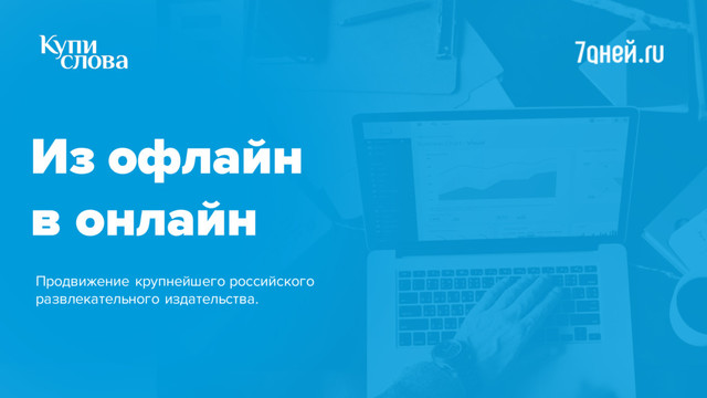 лет. За эти годы коллеги проявили себя как надежный партнер, который выполняет озвученные планы и мотивирован на результат. Могу смело рекомендовать «Купи Слова» как подрядчика по поисковой оптимизации и ведению контекстных кампаний.» Константин Качалов Директор по электронным медиа ЗАО «Издательство Семь Дней» Из офлайн в онлайн, продвижение развлекательного издательства «7 дней»