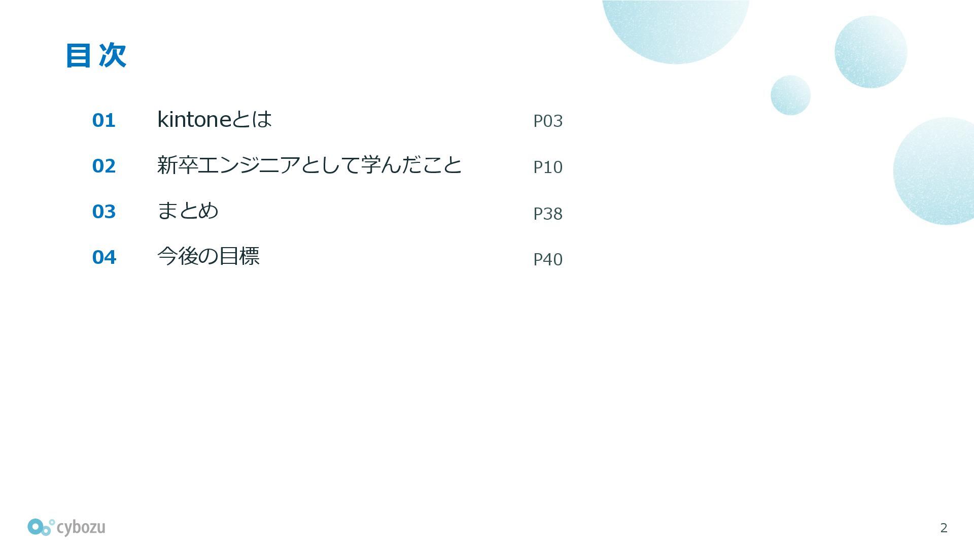 2 01 02 03 04 kintoneとは 新卒エンジニアとして学んだこと まとめ 今後の目標 P03