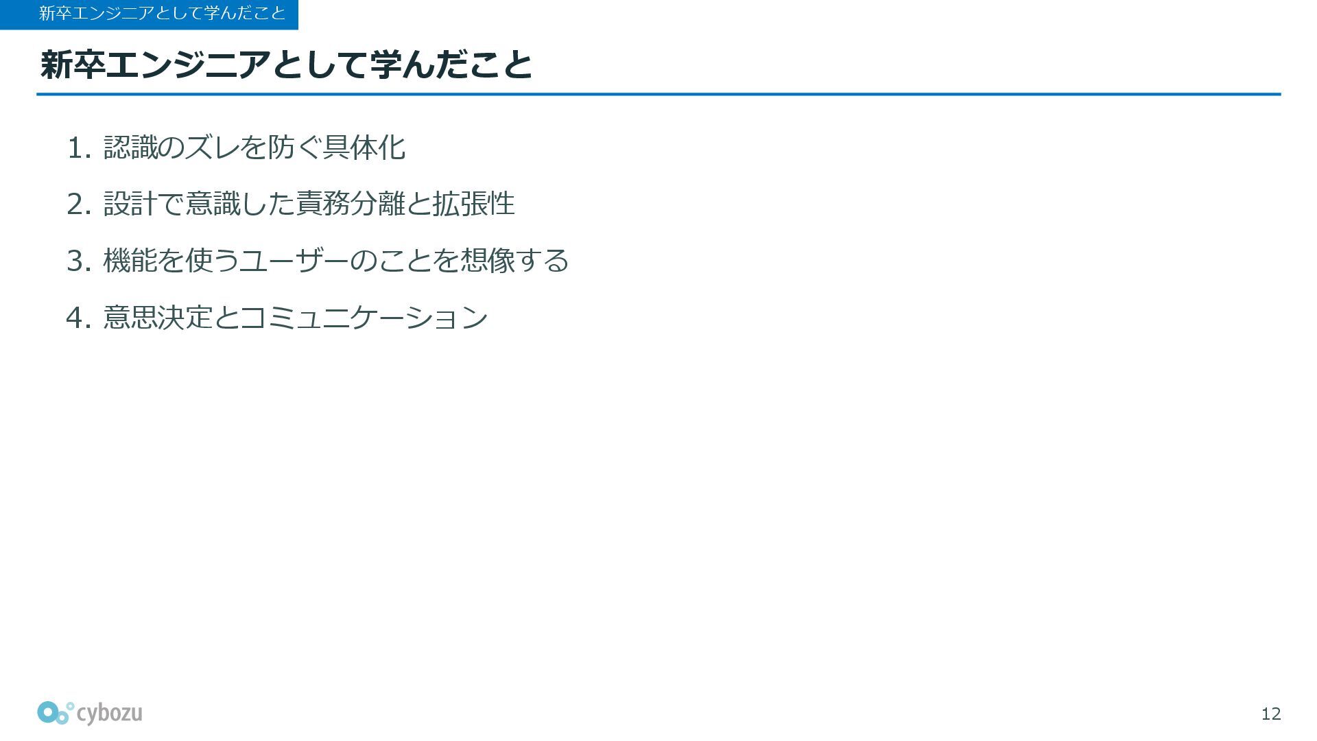 1. 認識のズレを防ぐ具体化 2. 設計で意識した責務分離と拡張性 3. 機能を使うユーザーのことを想像する 4. 意思決定とコミュニケーション 新卒エンジニアとして学んだこと 12