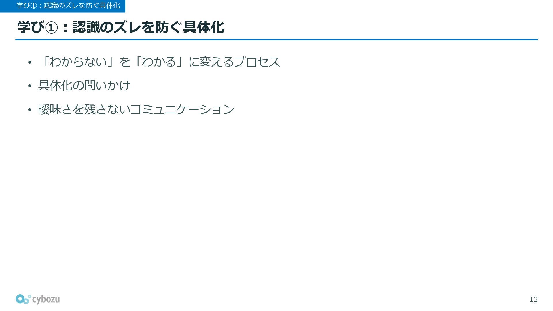 • 「わからない」を「わかる」に変えるプロセス • 具体化の問いかけ • 曖昧さを残さないコミュニケーション 学び①:認識のズレを防ぐ具体化 13 学び①:認識のズレを防ぐ具体化