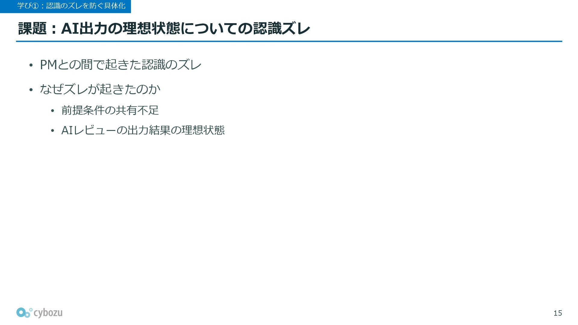 • PMとの間で起きた認識のズレ • なぜズレが起きたのか • 前提条件の共有不足 • AIレビューの出力結果の理想状態 課題:AI出力の理想状態についての認識ズレ 15